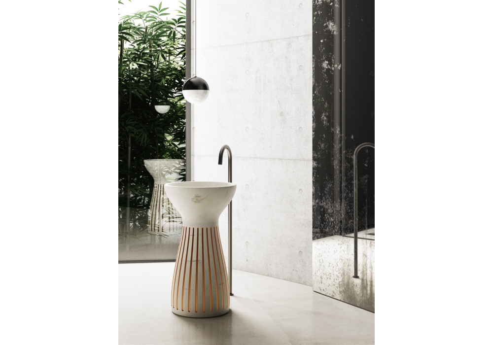 Roma conçu par Marco Piva pour Kreoo est un lavabo sur pied entièrement réalisé en marbre en différentes finitions. Disponible dans la version avec ou sans rainures à la feuille d'or.