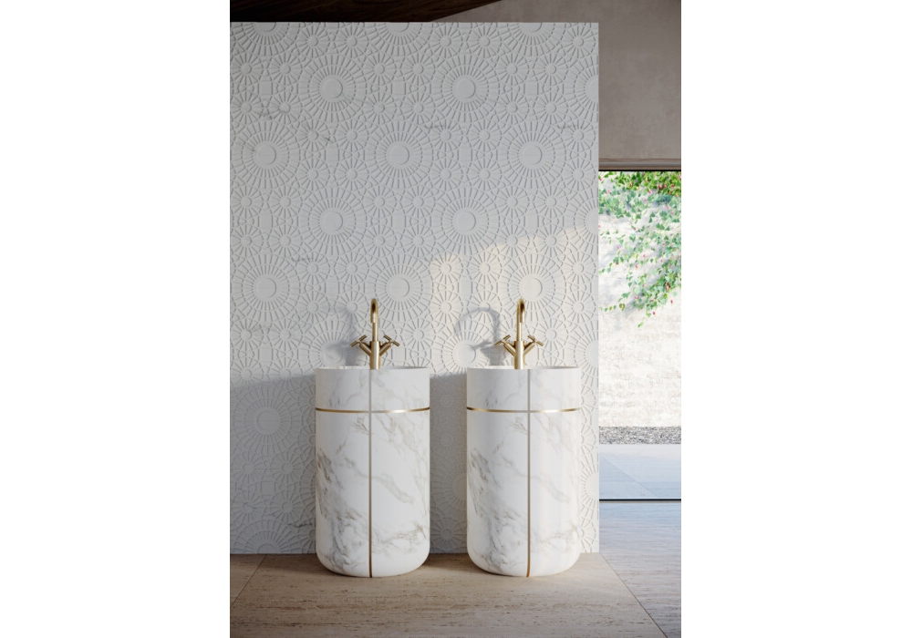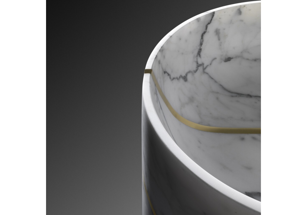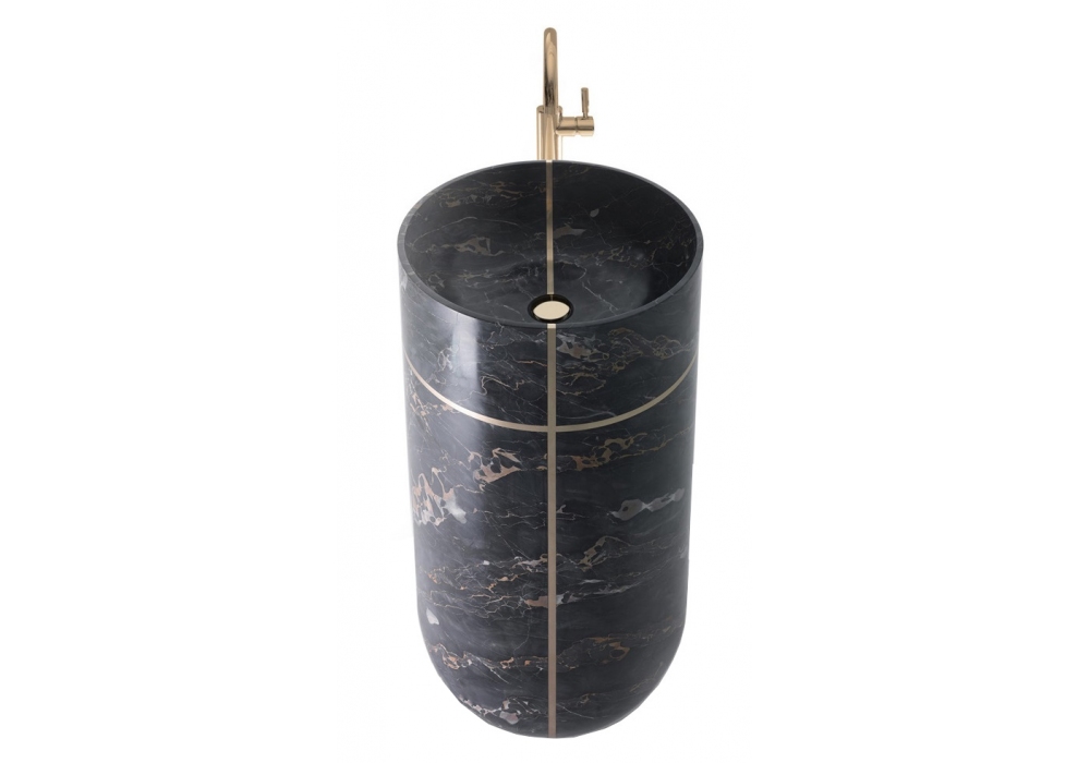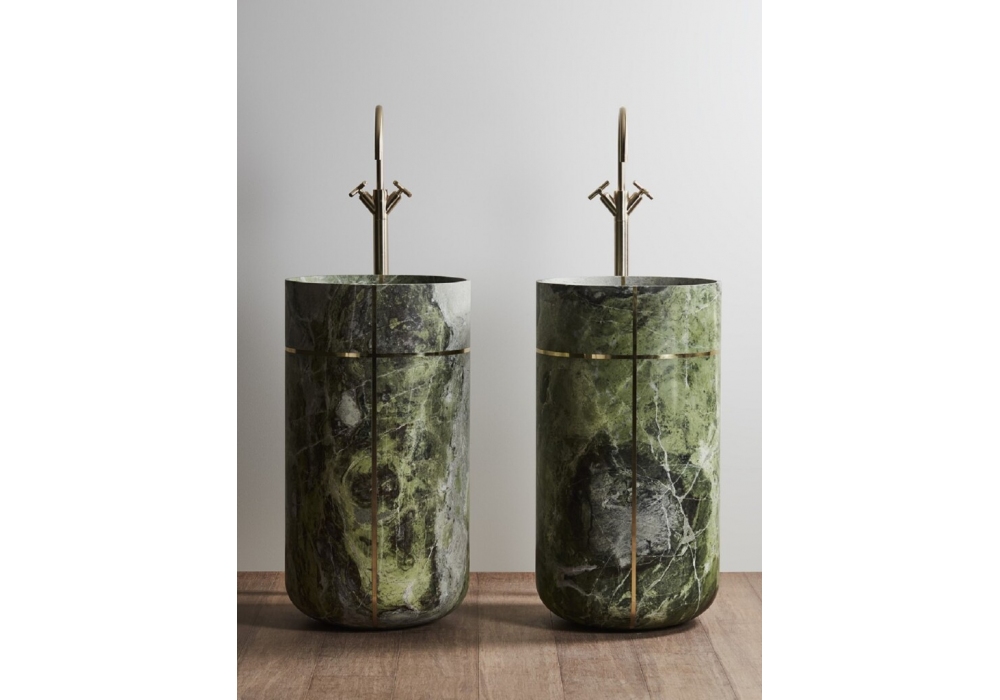 Tao conçu par Marco Piva pour Kreoo est un lavabo cylindrique sur pied en marbre de différentes finitions et traversé verticalement par des inserts métalliques en laiton.