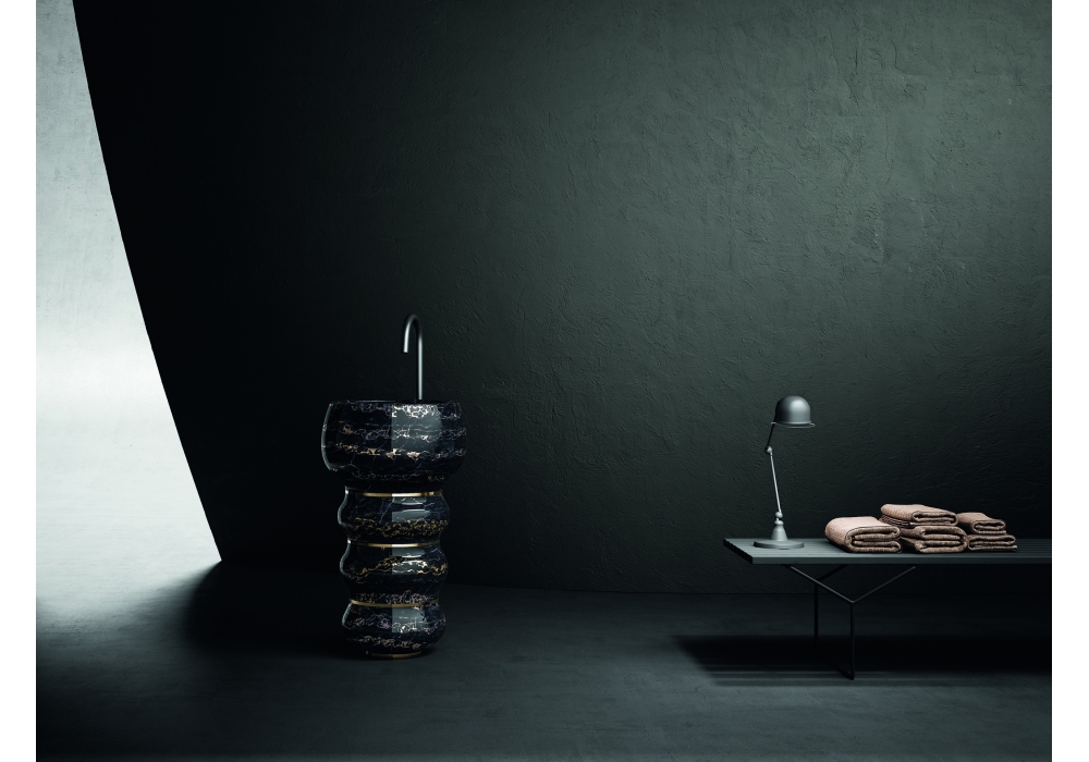 Bubbles conçu par Marco Piva pour Kreoo est un lavabo sur pied composé de différentes sections en marbre, divisées par des inserts métalliques circulaires en finition laiton doré. La double combinaison de couleurs est disponible sur demande.