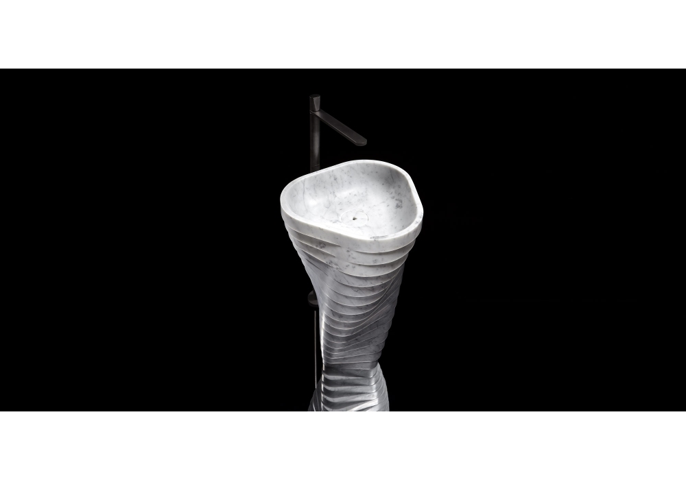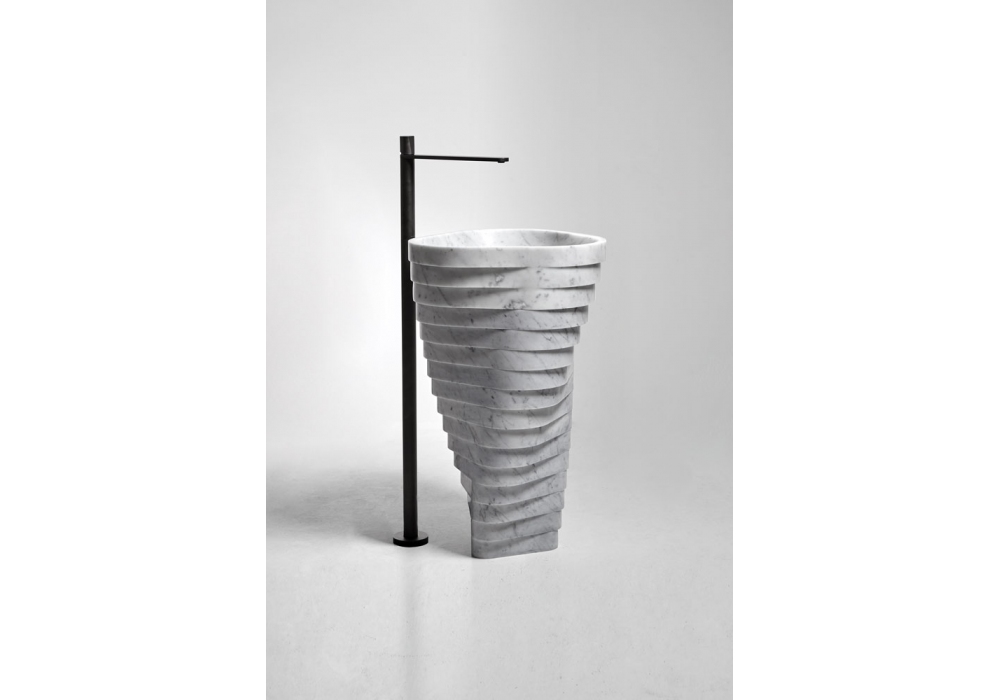 Vortice conçu par Paolo Ulian pour Antonio Lupi est un lavabo sur pied en pierre avec évacuation au sol, complet avec bonde à flux ouvert, siphon et tuyau flexible.