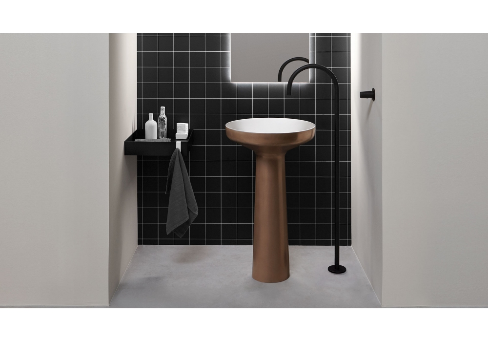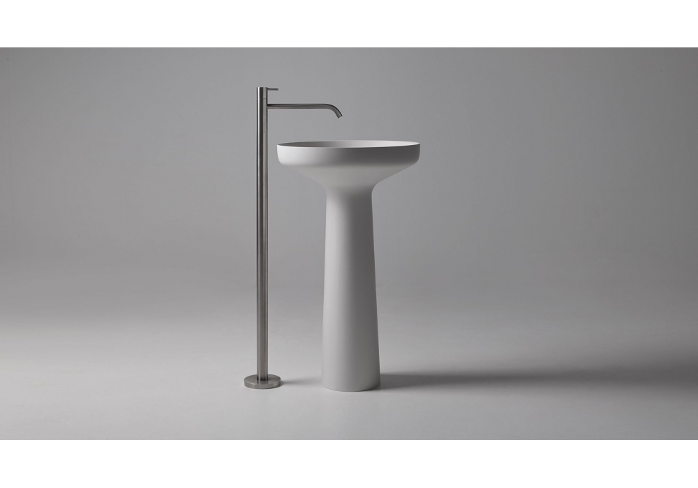 Ago85 conçu par Mario Ferrarini pour Antonio Lupi est un lavabo sur pied en Flumood ou Colormood avec siphon de sol, complet avec siphon ouvert, siphon et tuyau flexible.