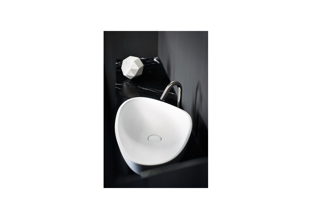 Drop conçu par Benedini Associati pour Agape, est un lavabo à poser façonné en Cristalplant® biobased ou en marbre dans différentes finitions. Il n'y a pas de trou pour la robinetterie, avec évacuation libre. Le lavabo, disponible en deux dimensions, est équipé d'une bonde avec bouchon au ras de la forme interne du lavabo dans la même finition que le lavabo.