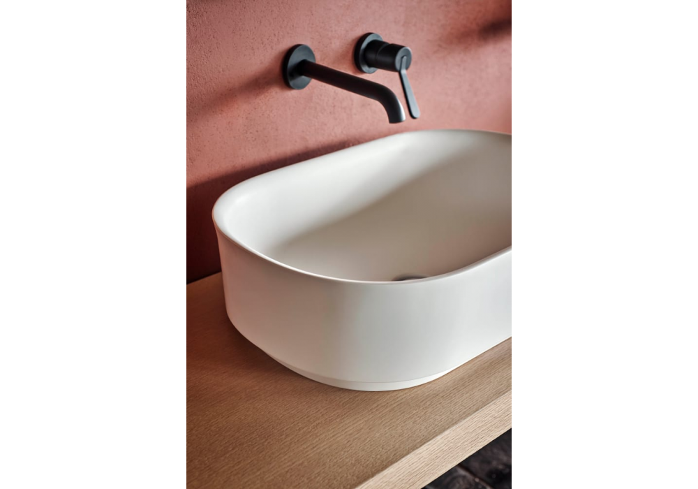Immersion conçu par Neri & Hu pour Agape, est un lavabo à poser en Cristalplant® biobased ou en marbre dans différentes finitions, sans trou pour robinetterie, avec bonde libre. Complet avec bonde.
