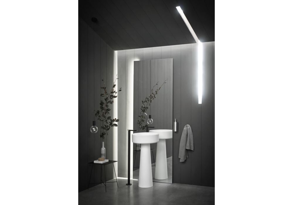 Bjhon 1 conçu par Angelo Mangiarotti pour Agape est un lavabo sur pied en marbre, Cristalplant® biosourcé ou Cementobasic® en différentes finitions. Il se caractérise par un bassin cylindrique et un appui au sol. Il n'y a pas de trou pour le robinet, évacuation gratuite. Disponible dans la version avec siphon mural ou au sol.