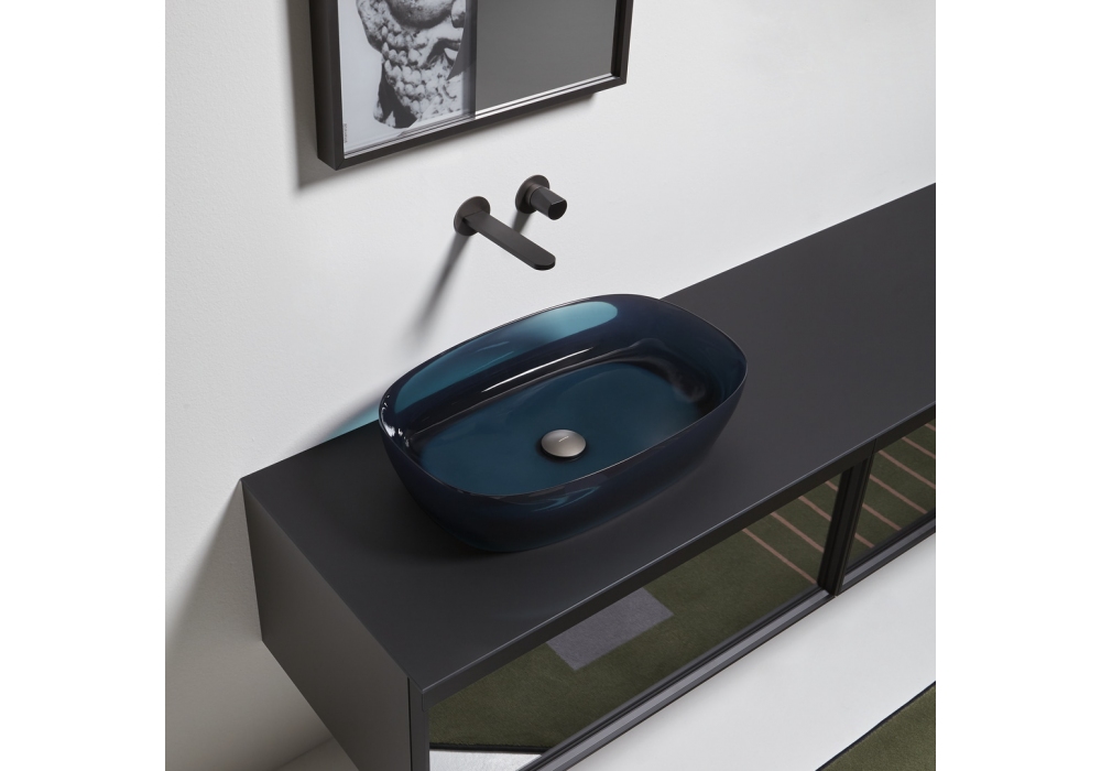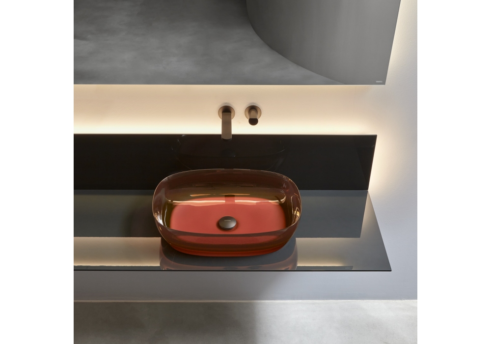 SensoC conçu par Nevio Tellatin pour Antonio Lupi est un lavabo à poser rectangulaire en Cristalmood ou Icemood complet avec bonde avec bouchon ouvert et raccord siphon.