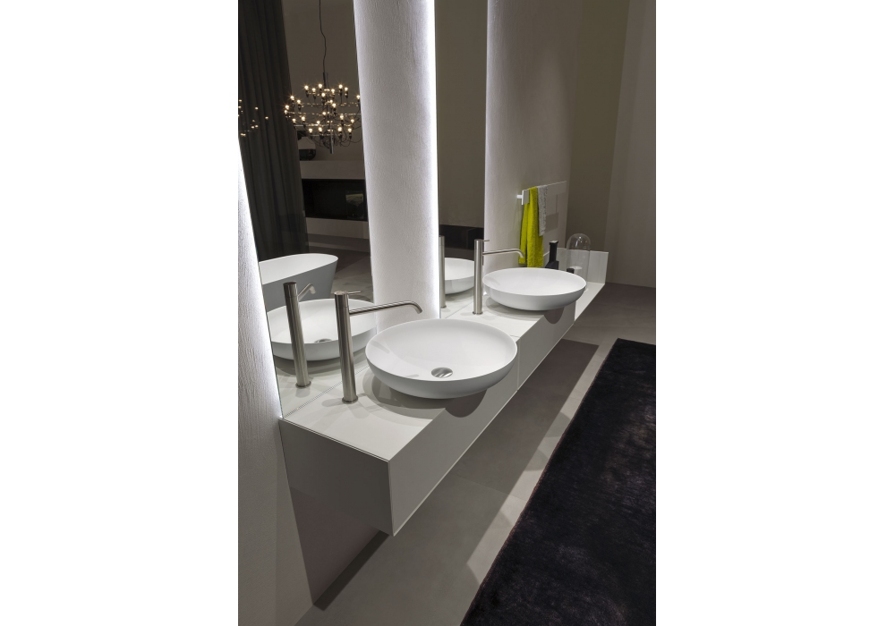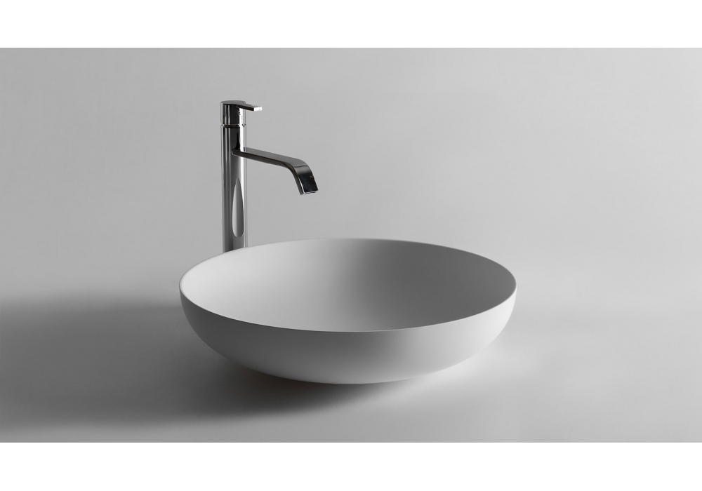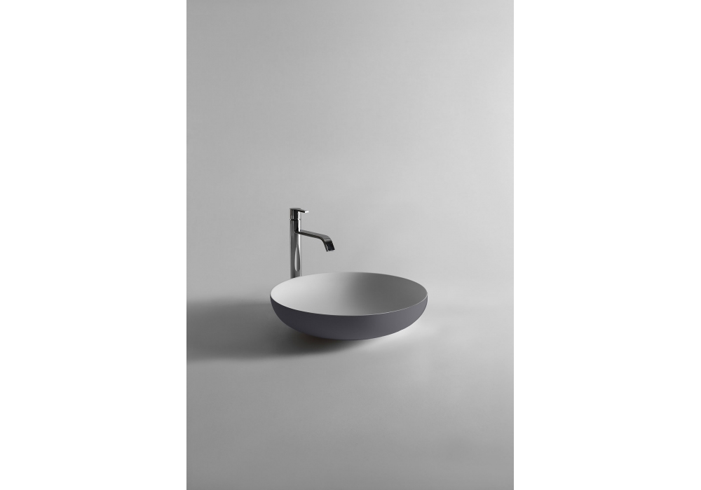 Verso conçu par Nevio Tellatin pour Antonio Lupi est un lavabo à poser rond en Flumood ou Colormood complet avec bonde avec bouchon ouvert et raccord siphon.