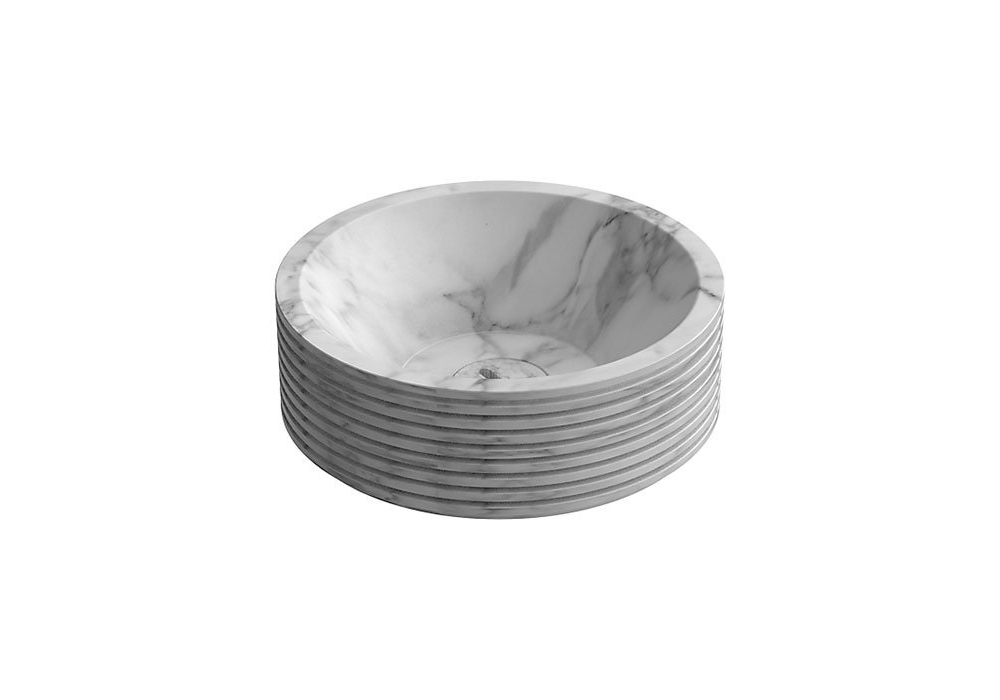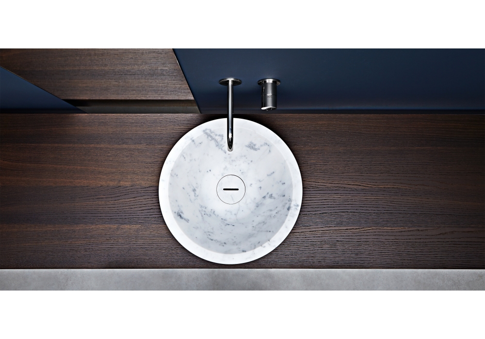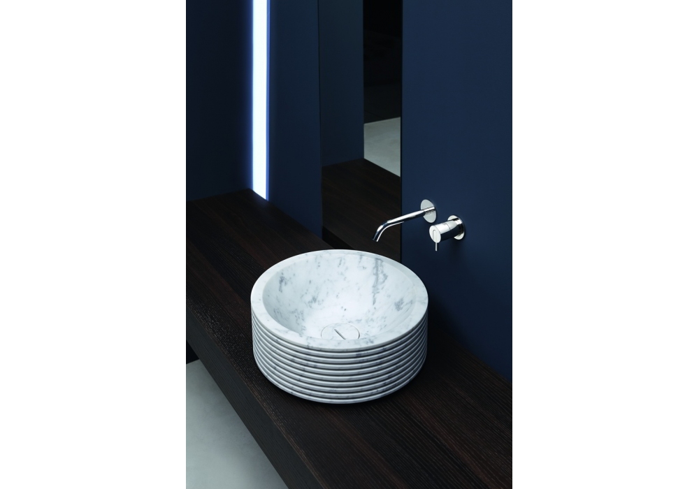 Introverso45 conçu par Paolo Ulian pour Antonio Lupi est un lavabo à poser rond en pierre, complet avec bonde à bouchon ouvert et raccord siphon.