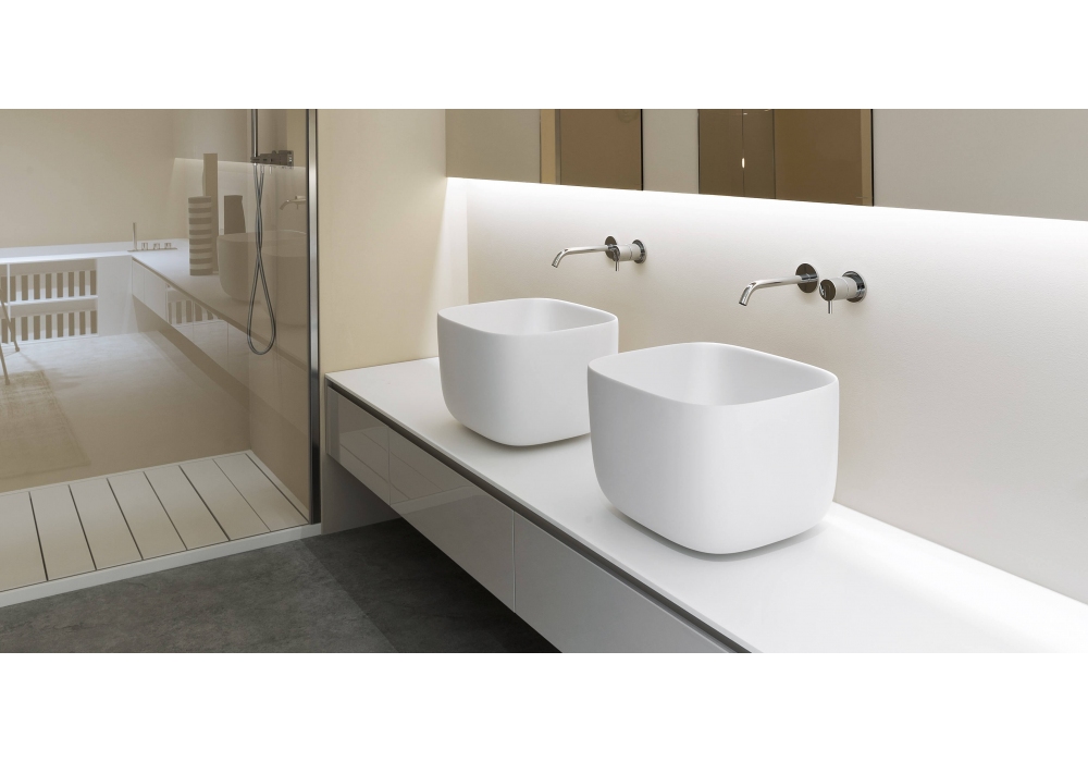 Poggio conçu par Nevio Tellatin pour Antonio Lupi est un lavabo à poser rectangulaire en Flumood ou Colormood complet avec bonde à vidage ouvert et raccord siphon.