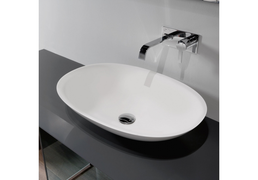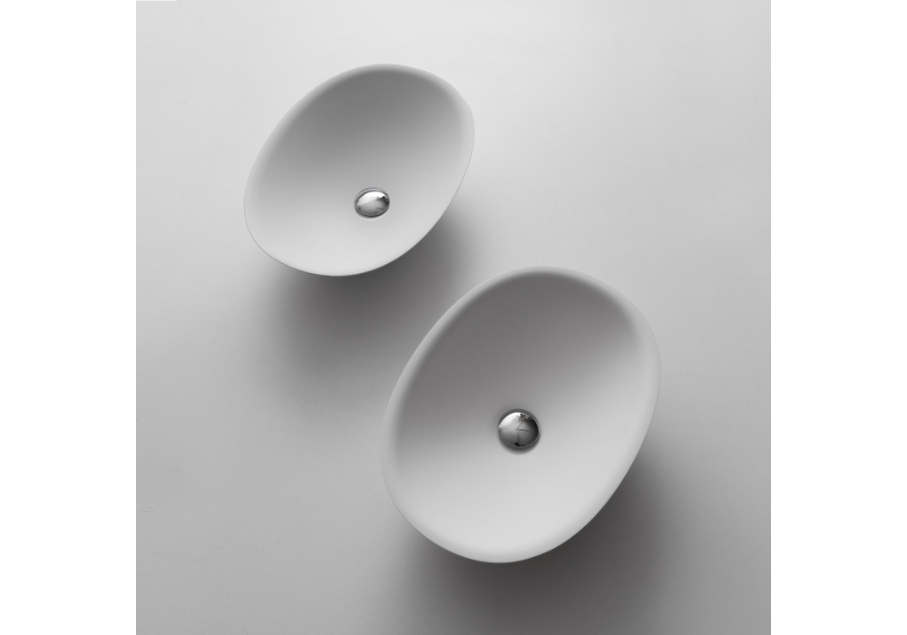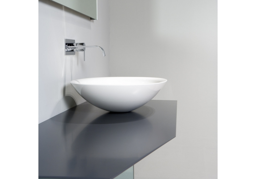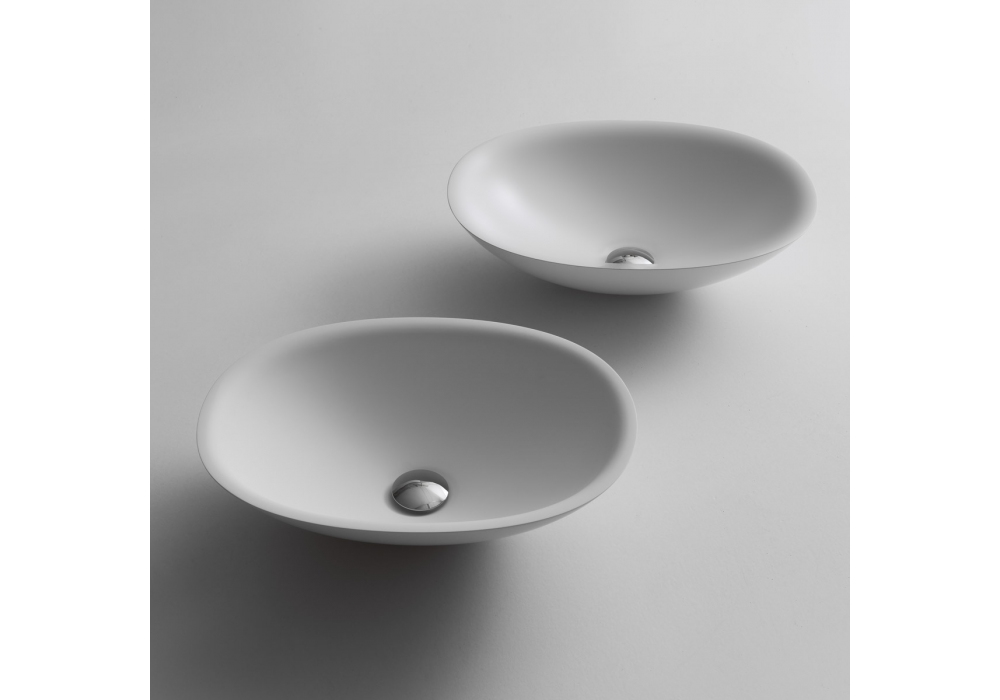 Servo conçu par Mario Ferrarini pour Antonio Lupi est un lavabo à poser en Flumood ou Colormood complet avec bonde à vidage ouvert et raccord siphon.