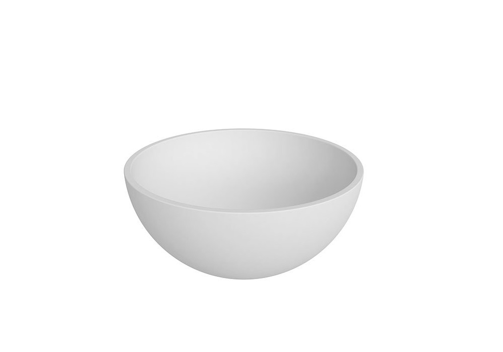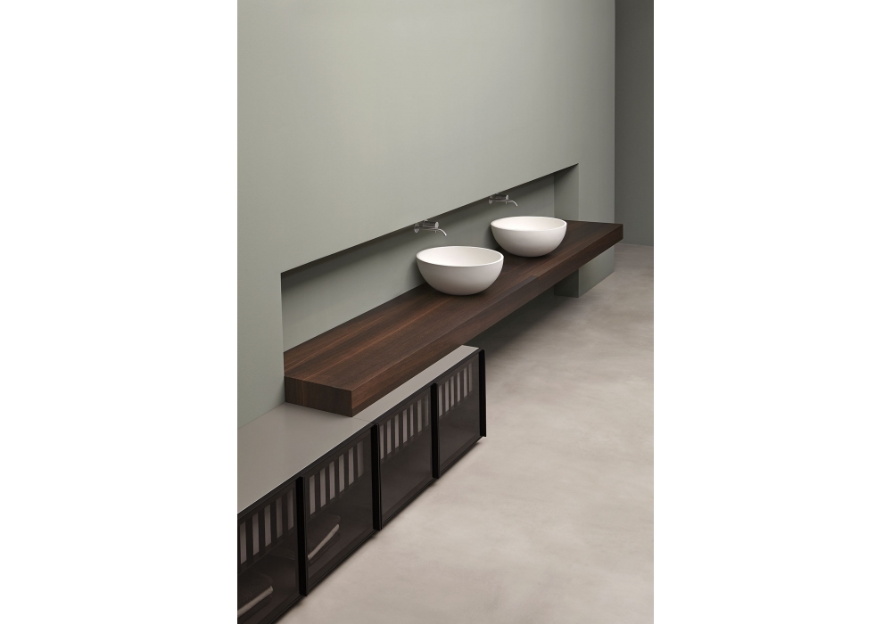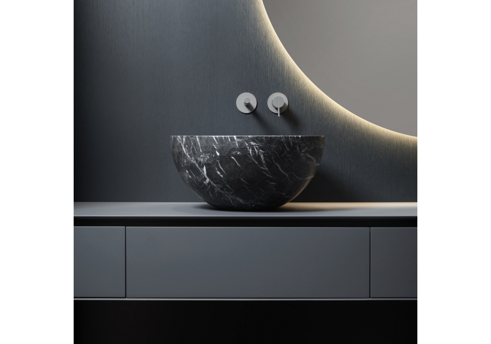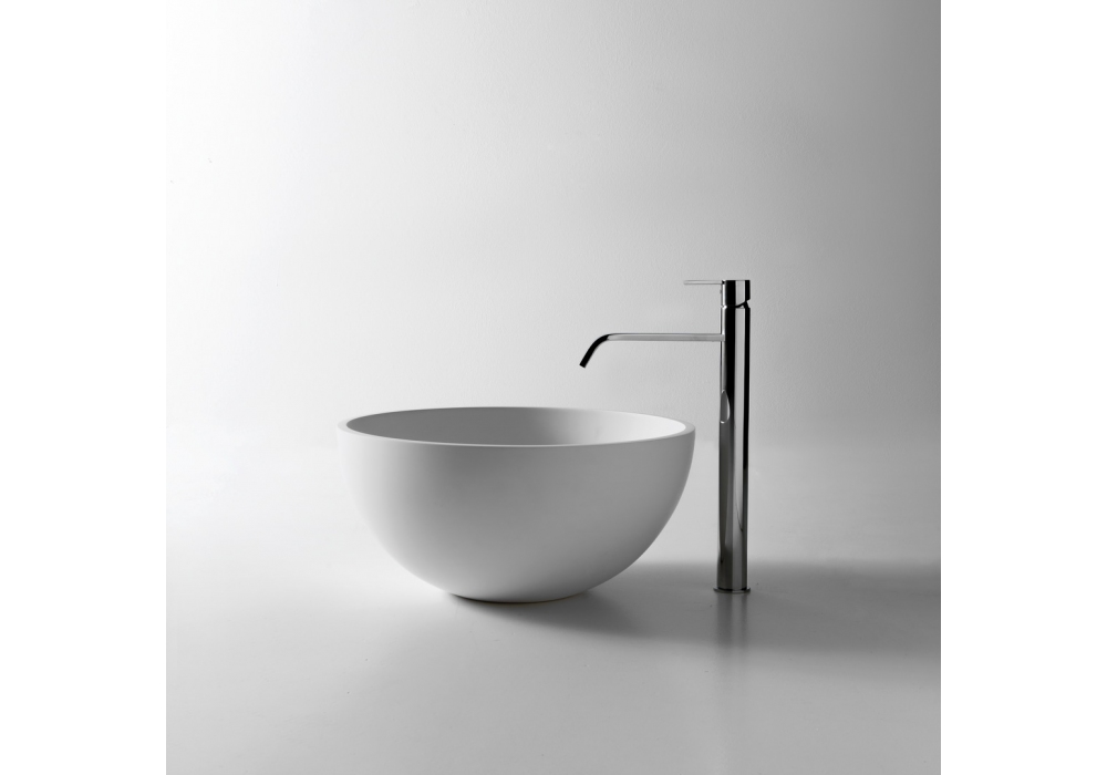 Urna conçu par Carlo Colombo pour Antonio Lupi est un lavabo à poser rond en Flumood, Colormood ou pierre complet avec bonde à vidage ouvert et raccord siphon.
