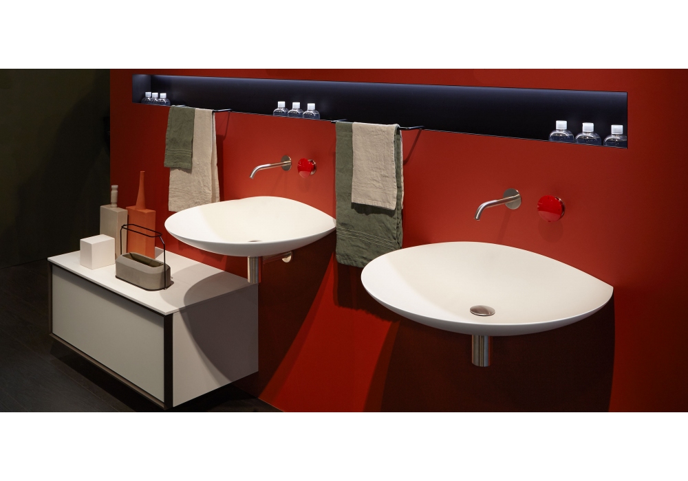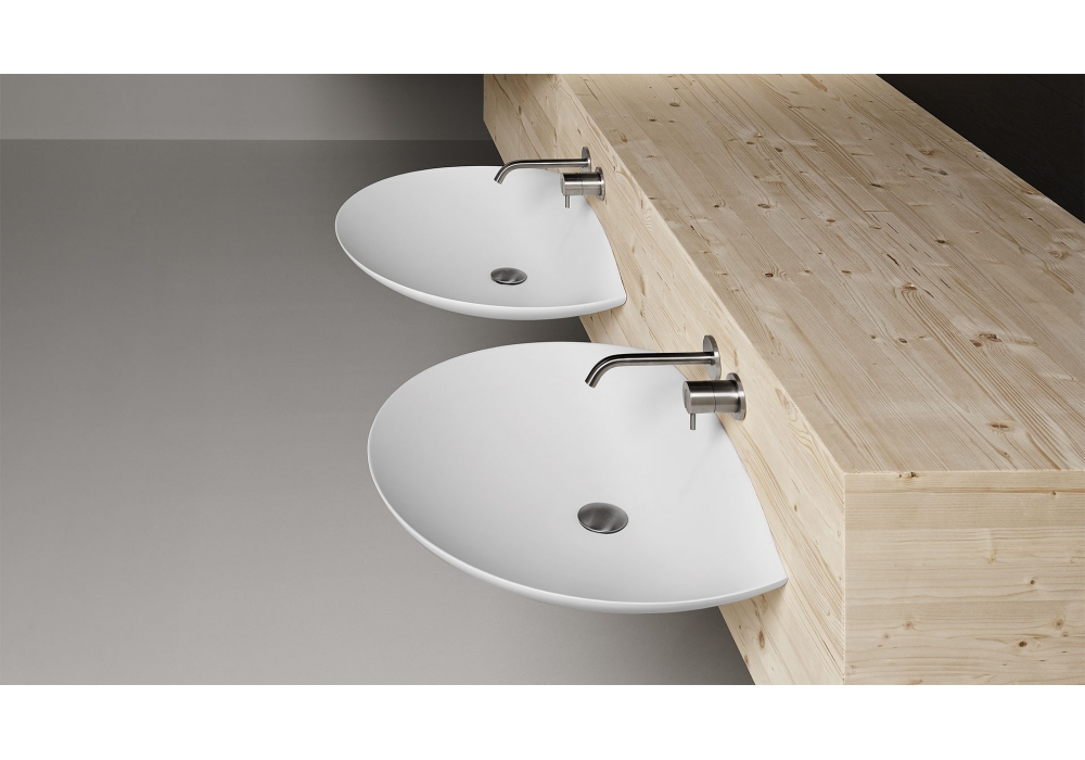 Venere conçu par Mario Ferrarini pour Antonio Lupi est un lavabo ovale à poser ou mural en Flumood ou Colormood complet avec bonde à vidage ouvert et raccord siphon.
