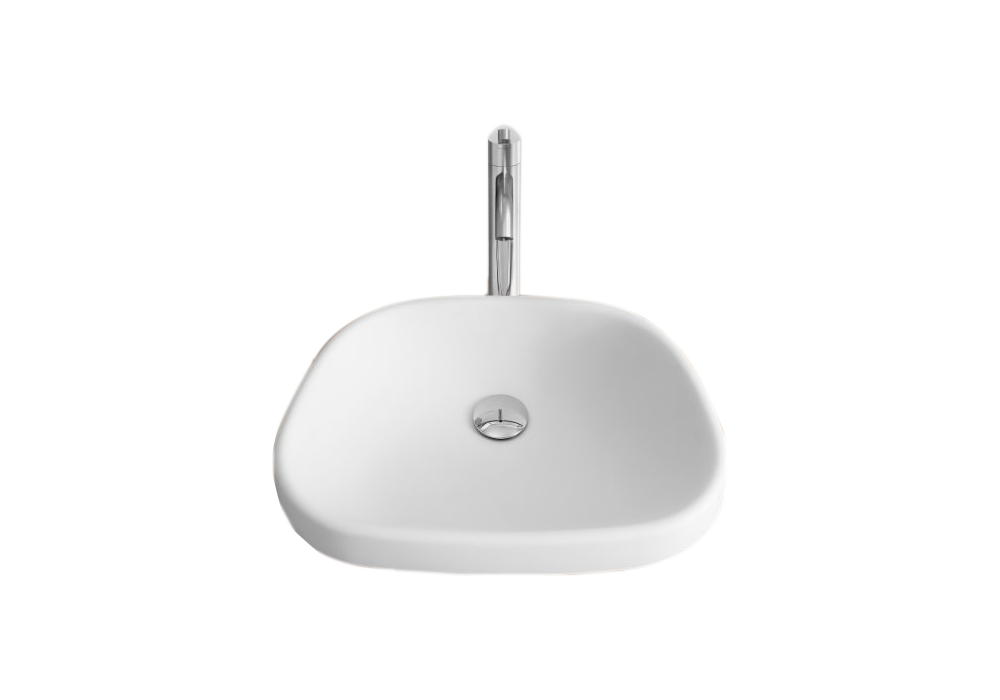 Pear conçu par Patricia Urquiola pour Agape, est un lavabo semi-encastré en Cristalplant® biobased blanc sans trou pour robinetterie, avec évacuation libre. Utilise un vidage.