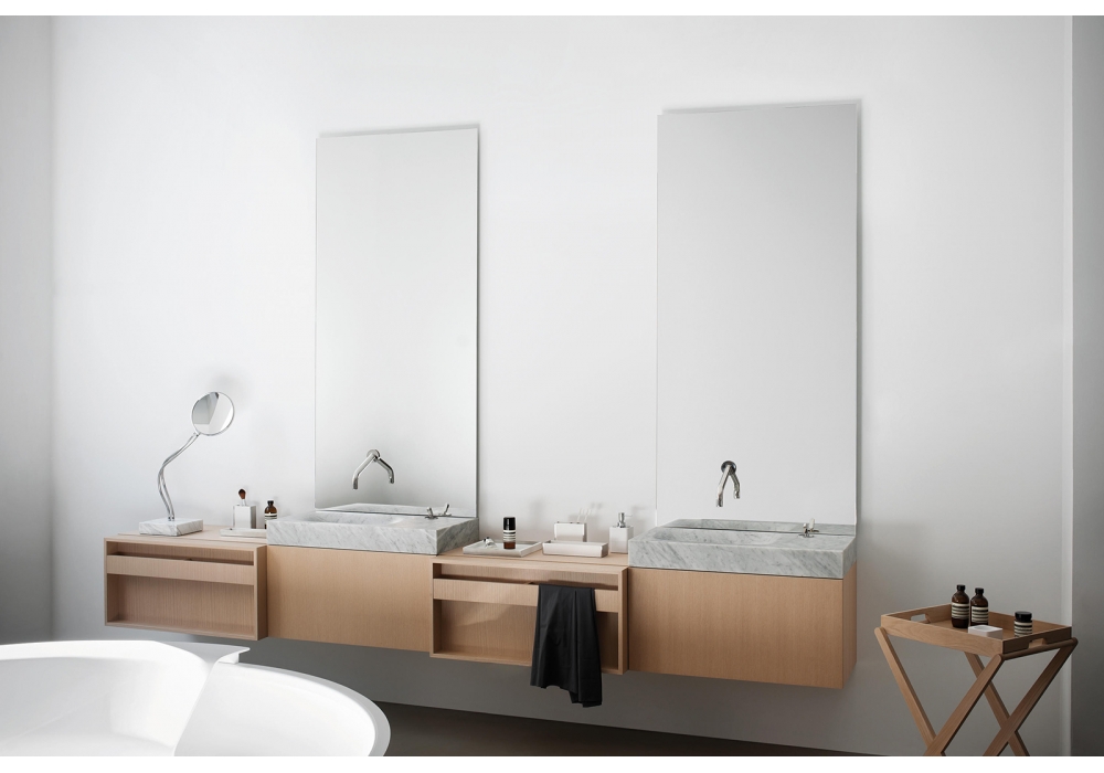 815 conçu par Benedini Associati pour Agape est un lavabo rectangulaire en Cristalplant® biobased ou en marbre dans différentes finitions sans trous ou avec trous pour le robinet et le contrôle de l'alimentation en eau, avec évacuation libre.
