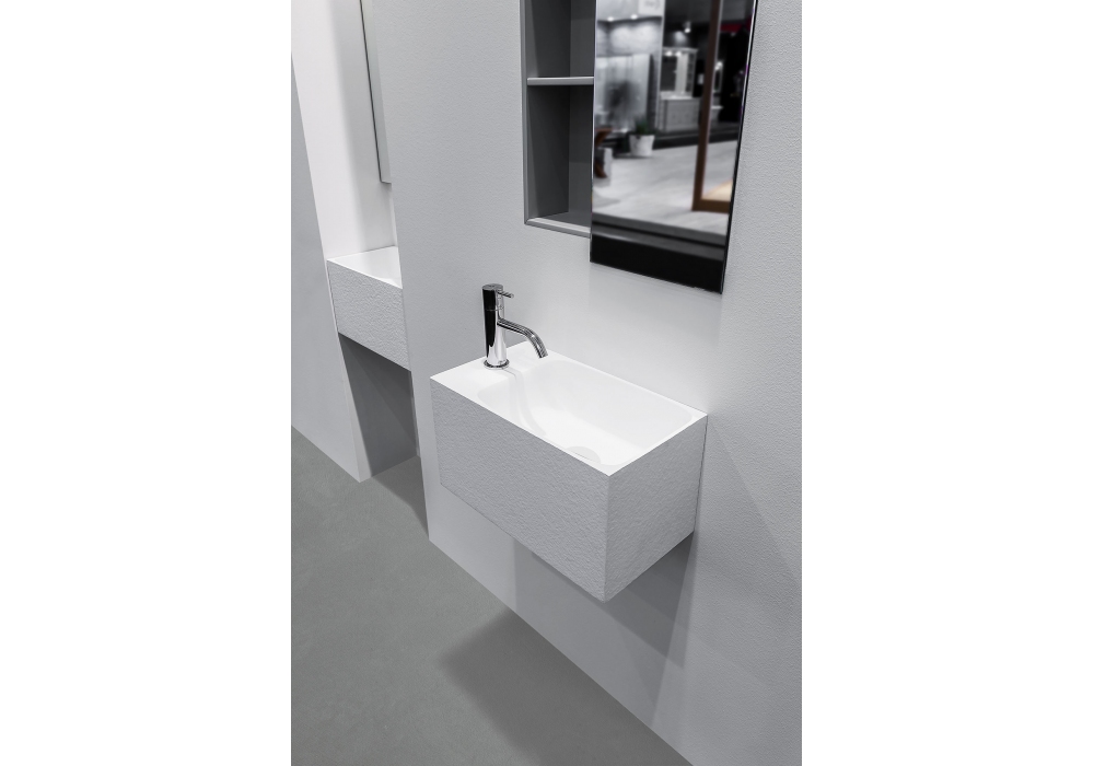Calco conçu par Nevio Tellatin pour Antonio Lupi est un lavabo mural rectangulaire en finition texturée Flumood, complet avec bonde à vidage ouvert et raccord siphon.