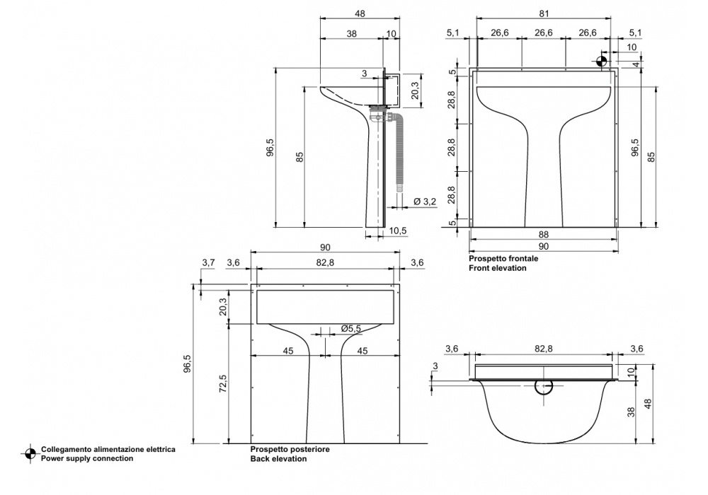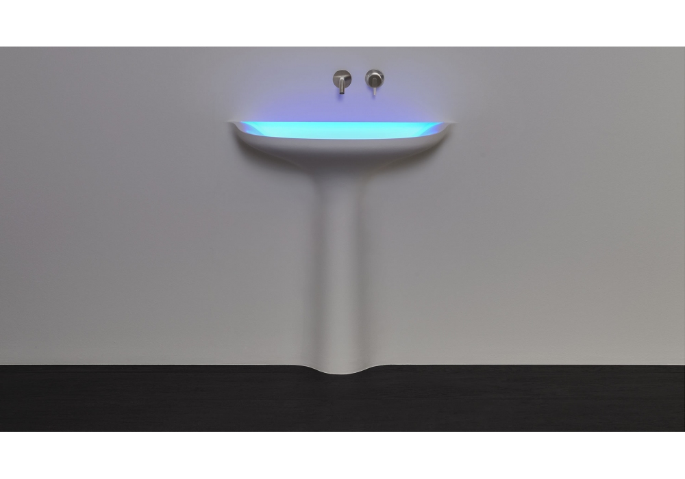 Calice conçu par Domenico De Palo et Mario Ferrarini pour Antonio Lupi est un lavabo mural en Moodlight, avec ou sans éclairage LED, complet de bonde inspectable, siphon, flexible et, dans la version LED, transformateur inclus.