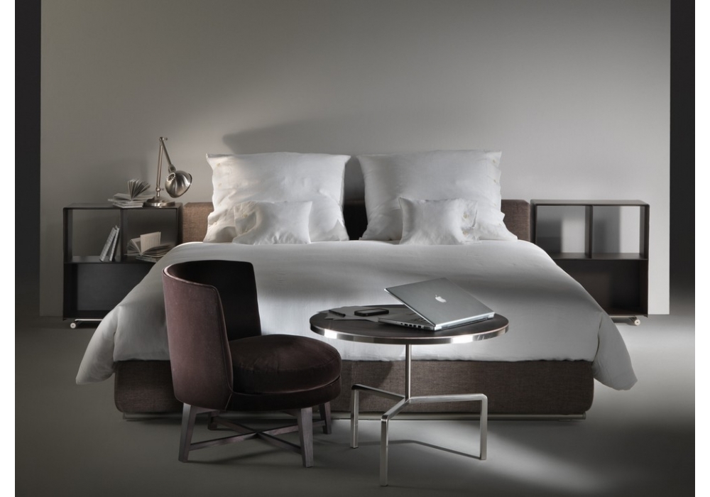 Groundpiece Slim is a bed designed by Antonio Citterio for Flexform. Base in wood with polyurethane padding covered with a protective fabric lining. Base with platform fitted with wooden slats. Headboard: in wood with polyurethane padding covered with a protective fabric lining. Feet: in metal treated with epoxy lacquer. Mattress not included.