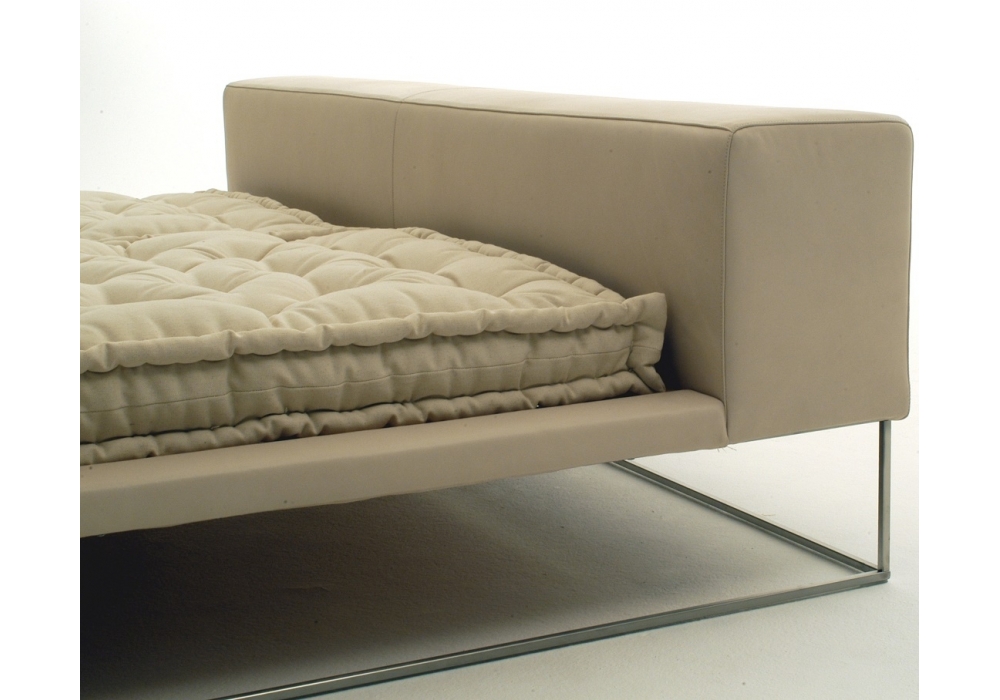 Ile Bed designed by Piero Lissoni for Living Divani is designed to enhance the time and space dedicated to rest. Bed with headboard and bedstead structure in double-paneled poplar and pine padded in differentiated density polyurethane foam. Covering in needle punched, resinated, nonwoven polyester fibre, bonded onto a polyamide velveteen backing. Base in AISI 304 stainless steel with matt-satin finish. Fabric or leather upholstery, both fully removable by Velcro fastenings. Fabric cover to protect the slat base, in 100% cotton, col. Ecru, fixed to the bedstead upholstery by zippers to open it on the sides and allow to inset the slat base.