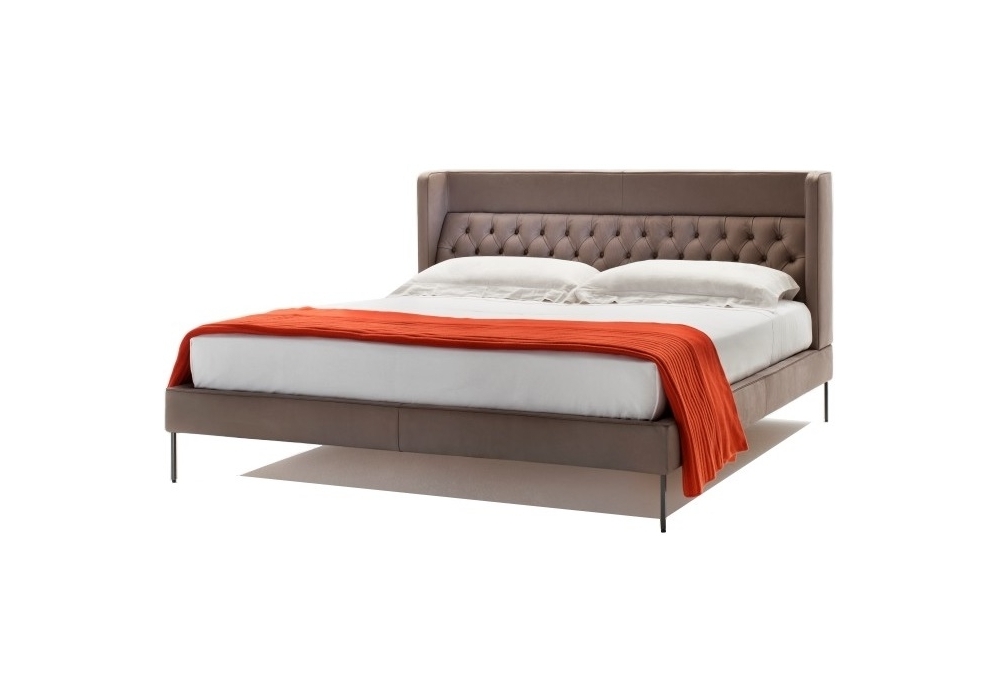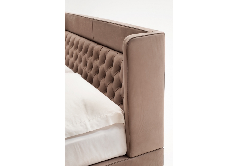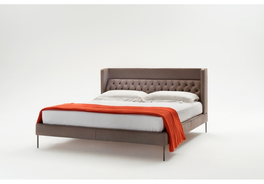 Lipp Bed designed by Piero Lissoni for Living Divani shows its characteristic and elegant sartorial detail on the headboard, a stylistic code but also a soft element to lean against. This classic and purified image is made extremely modern by the sharp cut of the shapes.