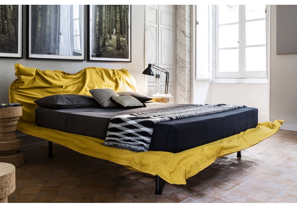 Big Hug conçu par Claudio Bitetti pour Mogg est un lit rembourré qui peut être modelé à volonté, avec revêtement amovible, avec sommier à lattes en bois de hêtre et pieds peints en anthracite. Disponible en différentes finitions et dimensions.