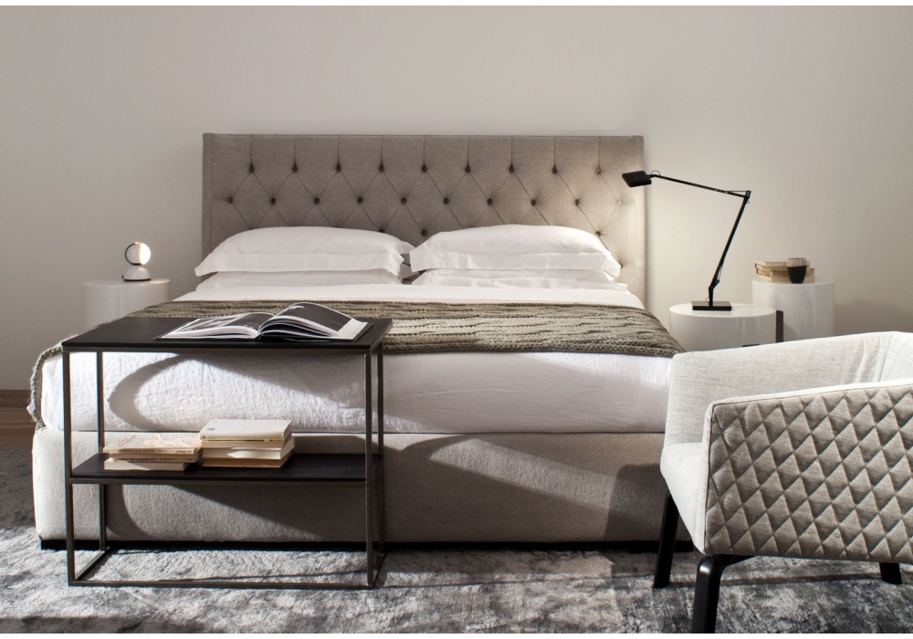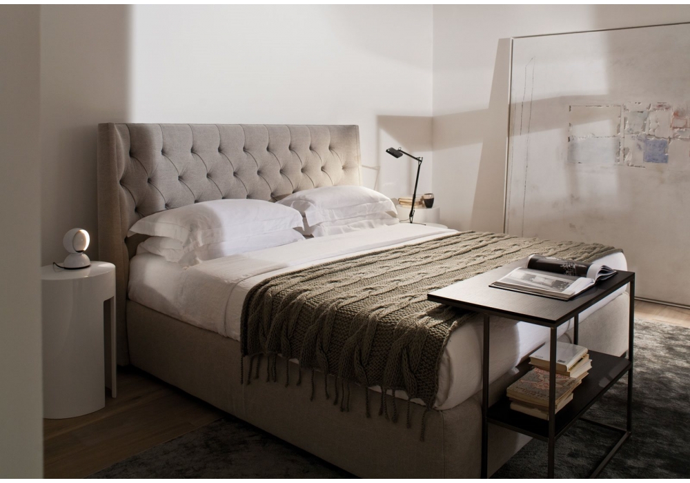 Turman Low conçu par Andrea Parisio pour Meridiani est un lit textile rembourré avec tête de lit capitonné non déhoussable. Structure démontable en bois avec barre centrale in métal. Pieds en bois teinté black, light et almond.