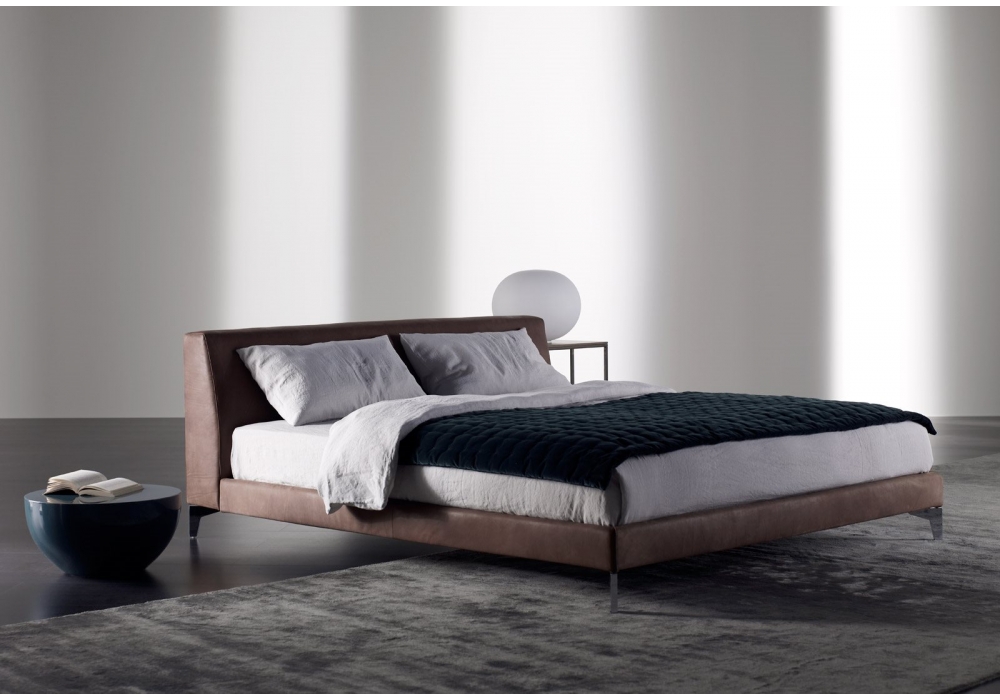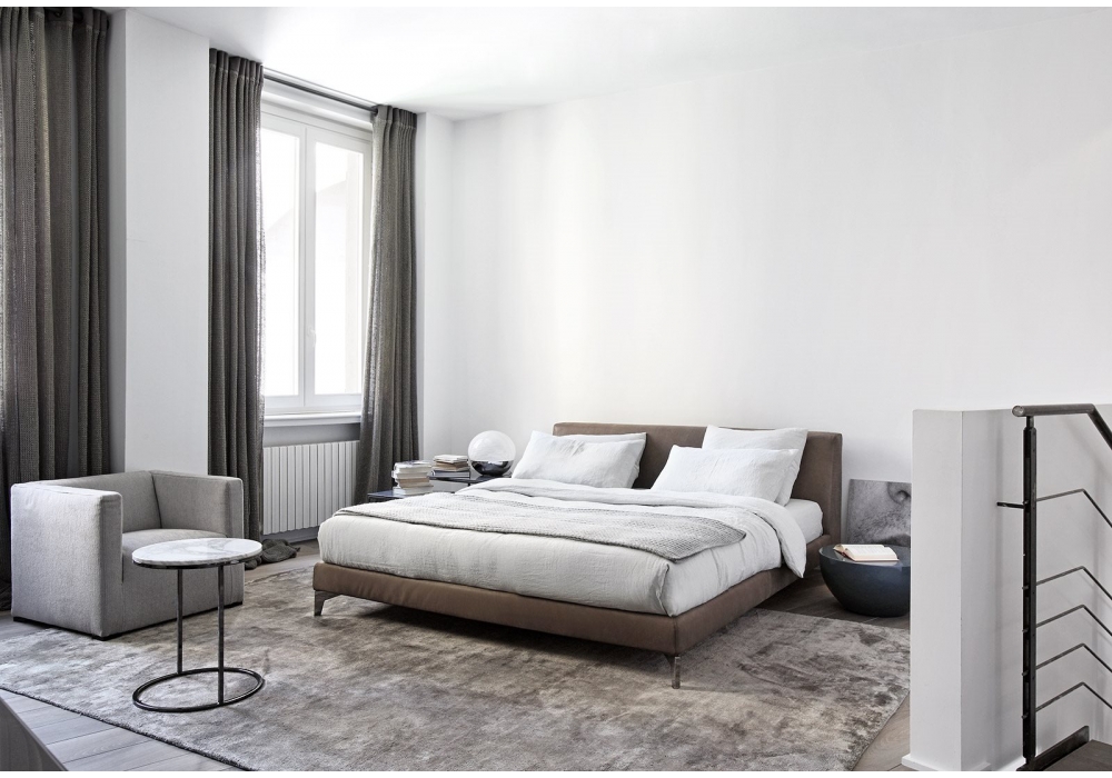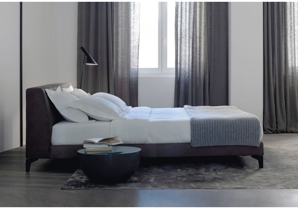 Louis Up Bed conçu par Andrea Parisio pour Meridiani est un lit textile rembourré avec revêtement déhoussable et fixe pour version en cuir. Structure démontable en bois avec barre centrale in métal. Pieds en métal.