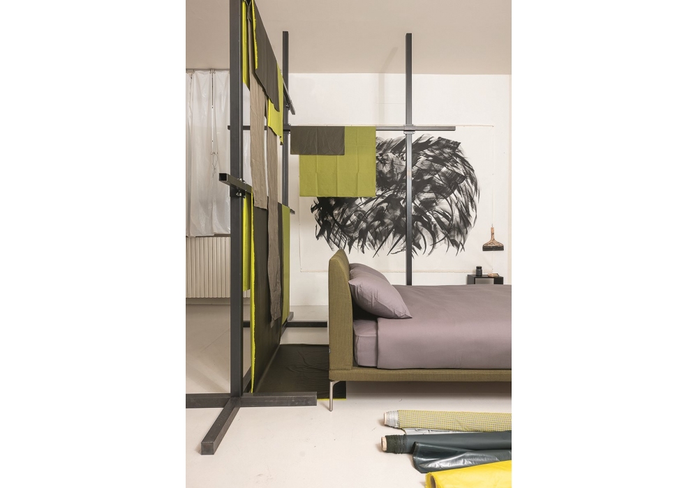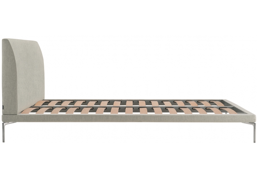 Talamo conçu par Damian Williamson pour Zanotta est un lit avec pieds en alliage d’aluminium poli. Structure en acier avec douves en hêtre courbé. Rembourrage de la tête de lit en polyuréthane/ fi bre polyester liée à chaud. Revêtement déhoussable en tissu ou en cuir.