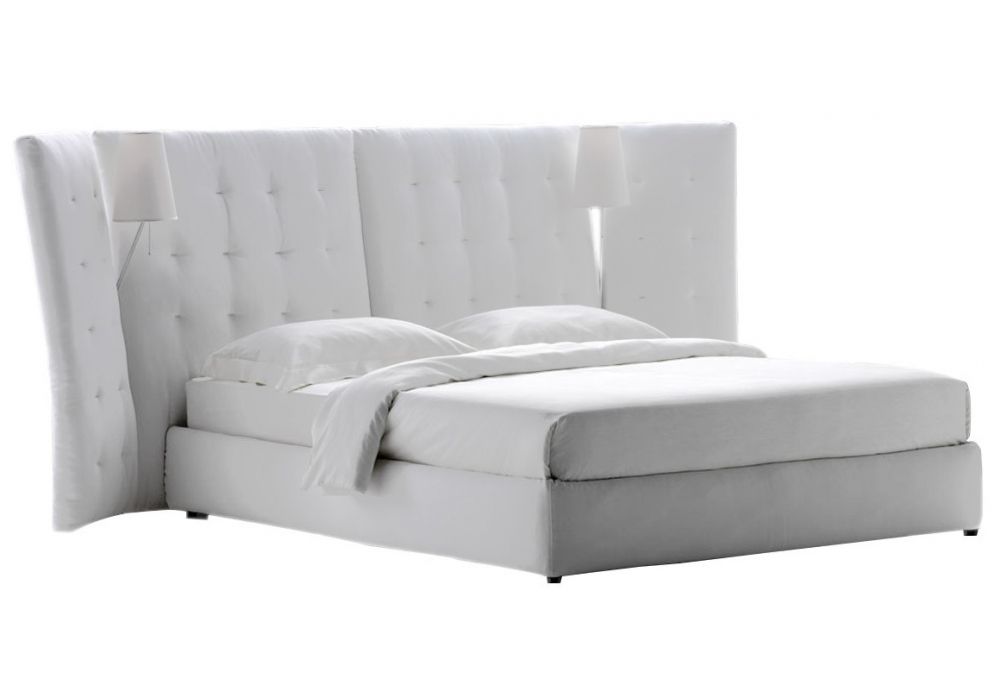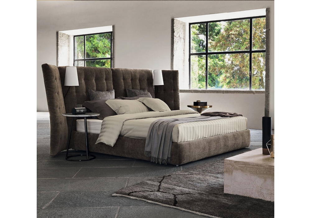 Angle conçu par Rodolfo Dordoni pour Flou est un lit à deux places à la ligne importante et deux volets latéraux. Têtière rembourrée capitonnée avec revêtement, entièrement déhoussable, en tissu ou en cuir. Disponible avec base à ressorts Leonardo, base fixe h 25 cm, avec sommier à coffre ou avec mouvements électriques. Dans l'intersection entre la têtière et les volets, Angle avec volets peut accueillir deux lampes Angle avec structure en tubulaire chromé brillant, doré ou nickel noir.