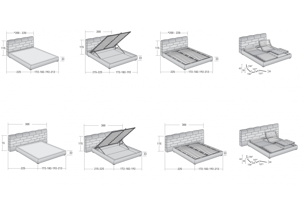 | Dimensions matelas | 160 x 200 cm; 170 x 200 cm; 180 x 200 cm; 200 x 200 cm. |