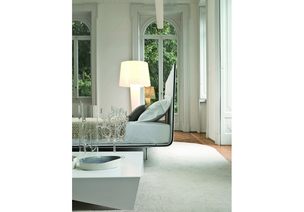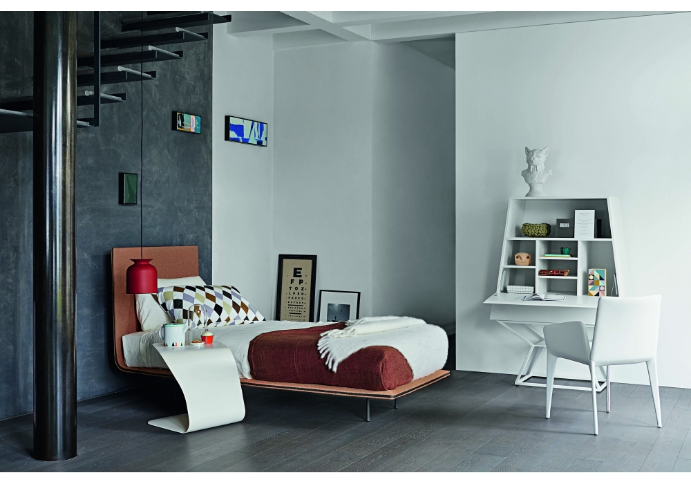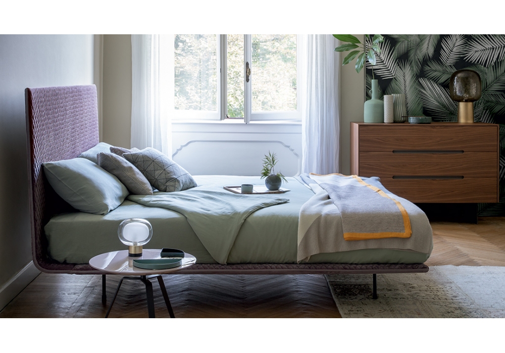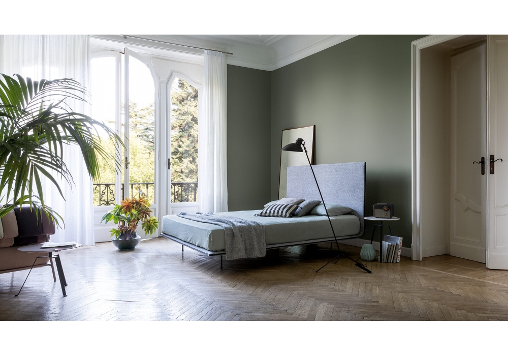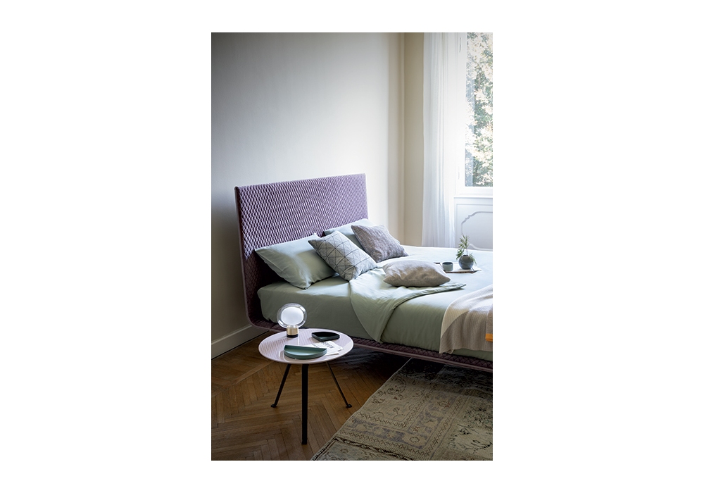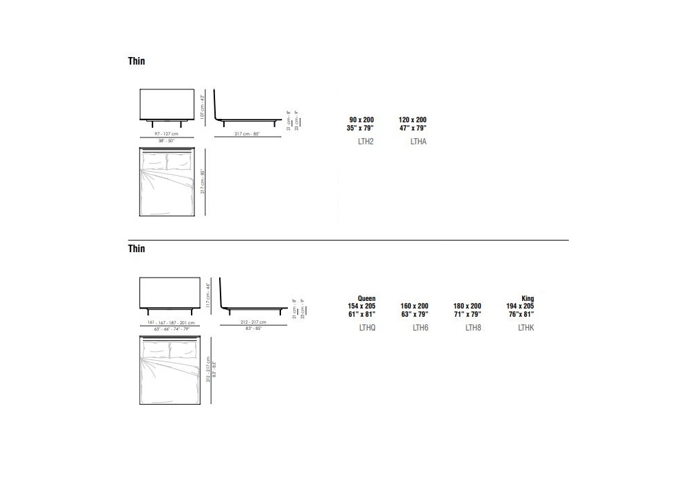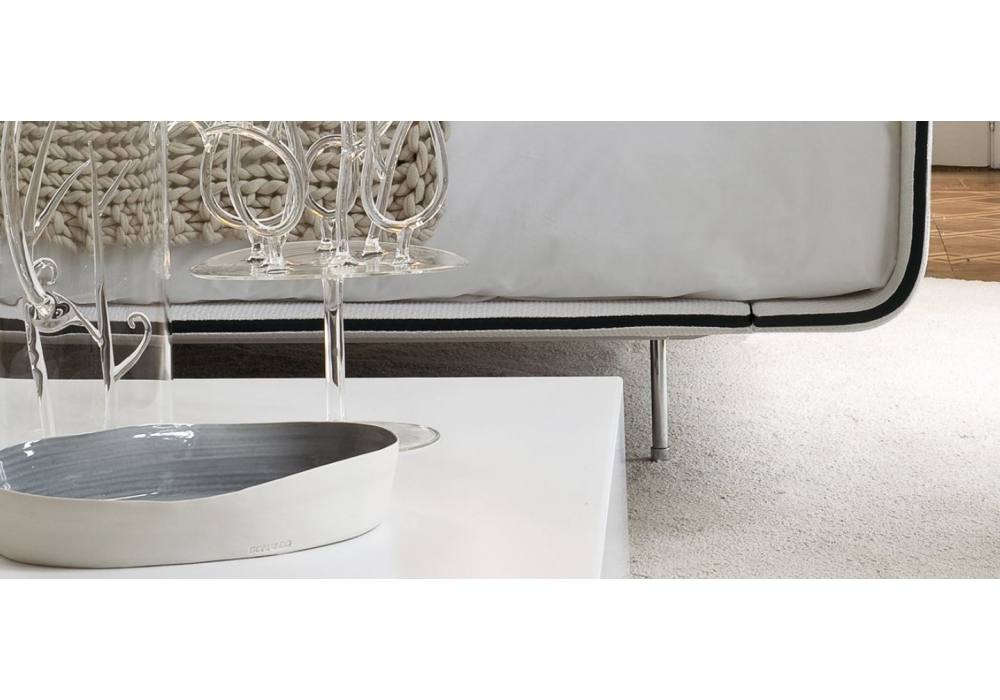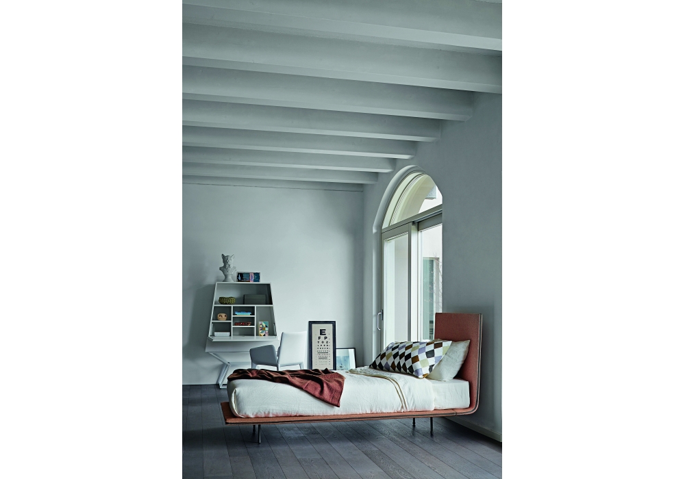 Thin conçu par Giuseppe Viganò pour Bonaldo est un lit disponible avec des dimensions de lit simple ou double. Le rembourrage est disponible en différents tissus et le bord latéral est décoré d'un ruban, de différentes couleurs. La base se compose de pieds en métal verni mat dans différentes finitions.