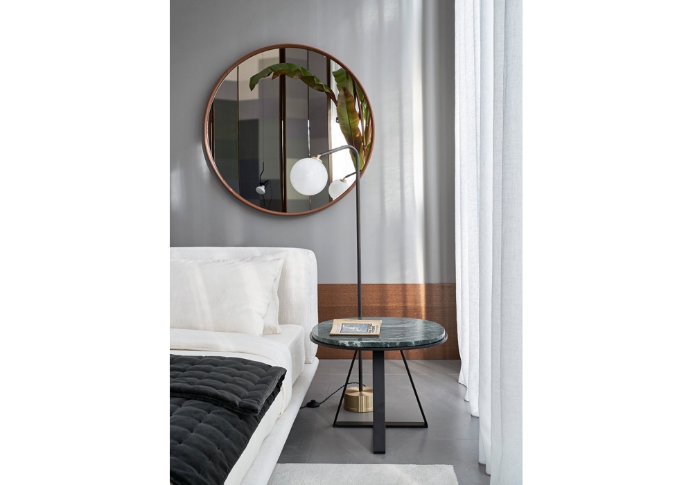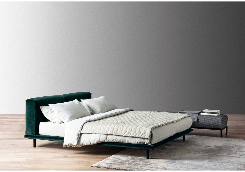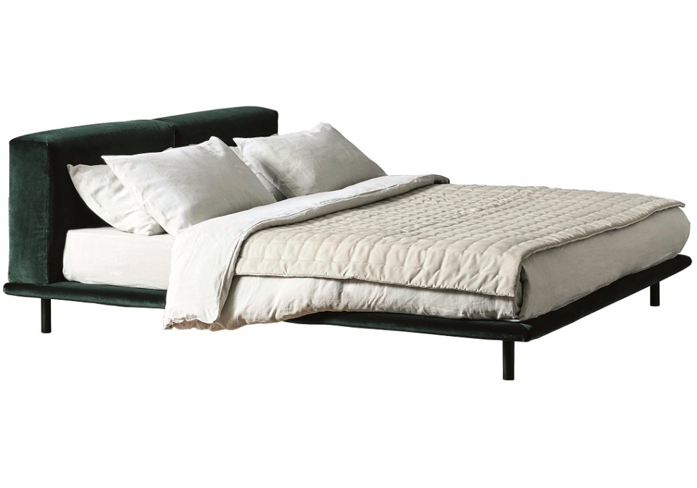 Timothy conçu par Andrea Parisio pour Meridiani est un lit avec structure en métal verni, rembourrage en polyuréthane de différentes densités, mousse viscoélastique et fibres de polyester, pieds en métal noir et revêtement en tissu ou cuir.