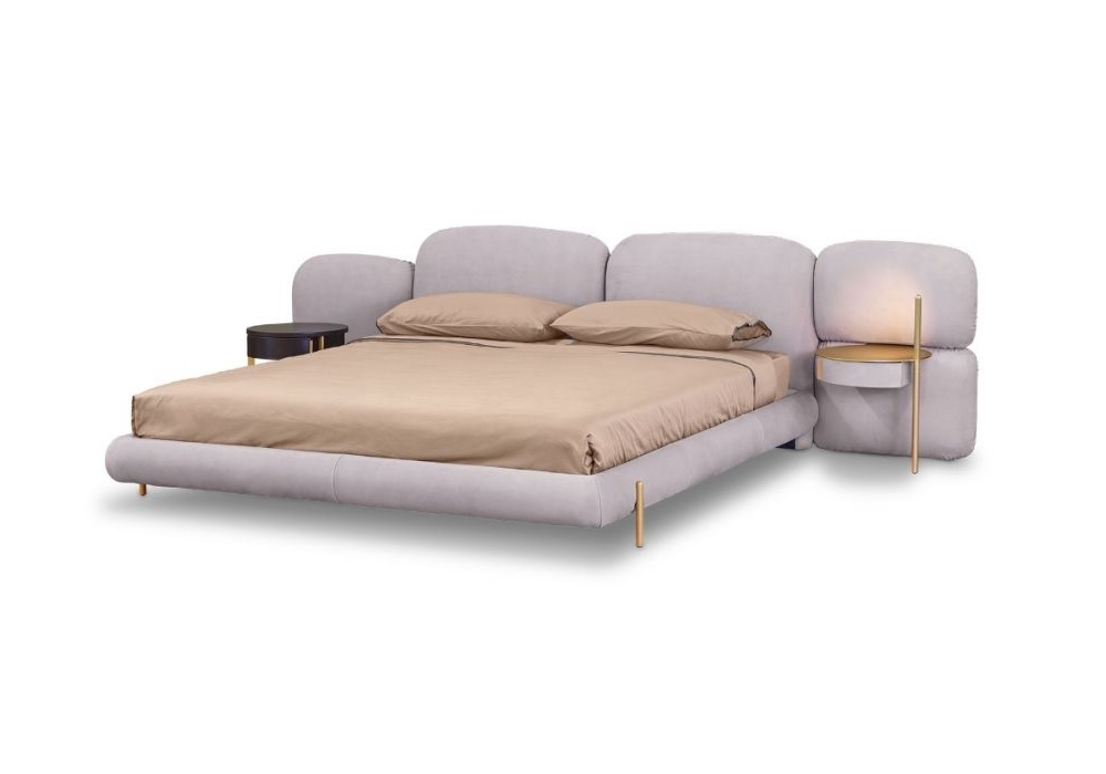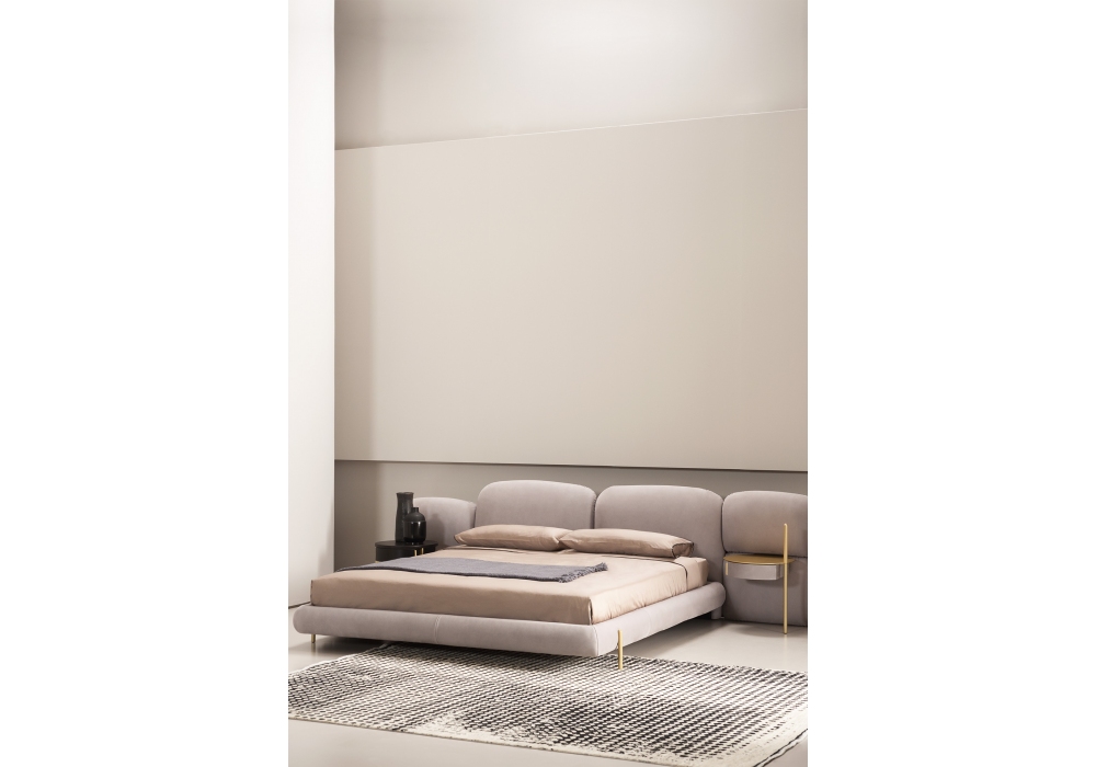 Stone conçu par Federico Peri pour Baxter est un lit composé d'un cadre de lit à quatre bandes. Modules de tête de lit centrale fixés au mur et éléments de tête de lit latéraux supplémentaires en contreplaqué et nid d'abeille sapin et peuplier. Revêtement en cuir amovible. Pieds en aluminium plaqué laiton satiné avec vernis mat.