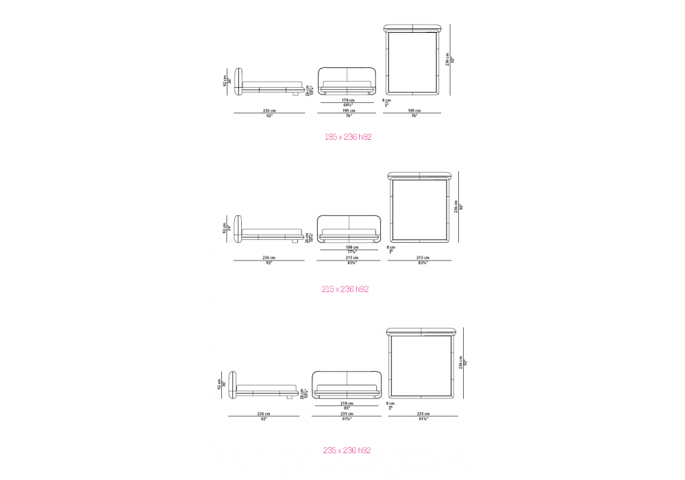 | Dimensions | 195 x 236 x H 92 cm; 215 x 236 x H 92 cm; 235 x 236 x H 92 cm. |