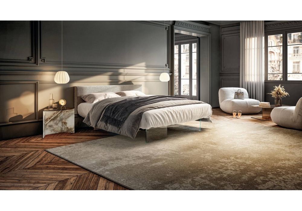 Air conçu par Daniele Lago est un lit suspendu sur des supports en verre trempé extra-clair. La tête de lit est recouverte de tissu ou de cuir complètement déhoussable. Le lit est autoportant, il peut donc également être placé au centre de la pièce. Différents accessoires sont disponibles tels que: éclairage sous le lit, conteneur avec tiroir, étagère et accoudoir bibliothèque. Le lit est disponible en différentes finitions et tailles.