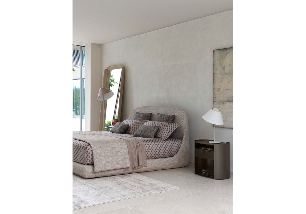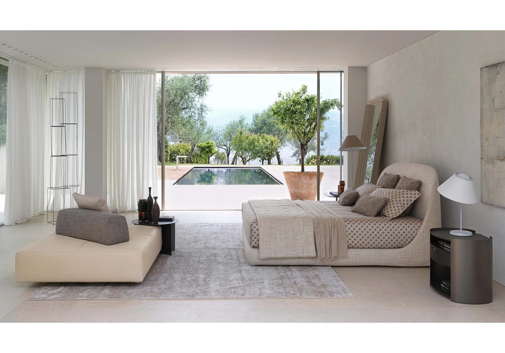 Taormina conçu par Flou est un lit avec base et tête de lit rembourrés. La tête de lit à revêtement amovible, en tissu ou en cuir, est soulignée par les coutures apparentes qui parcourent tout le périmètre. Il est disponible avec une base à ressorts ensachés.