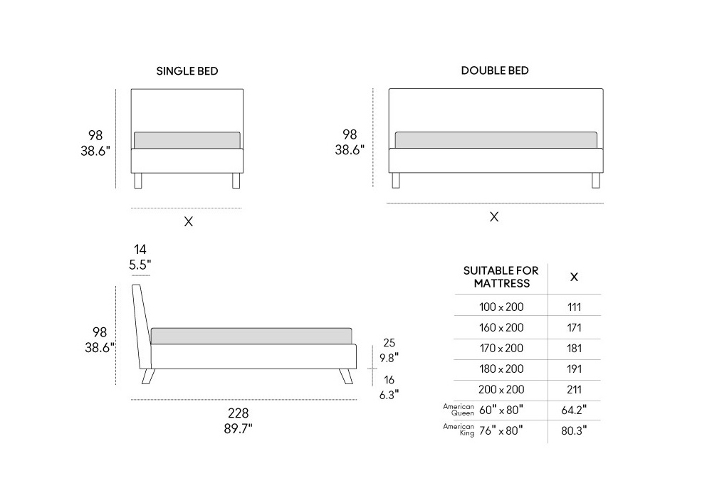 Bahamas Mid-Century conçu par Orizzonti Design Center pour Casamania & Horm est un lit rembourré avec revêtement amovible en tissu, cuir ou simili cuir. Sommier à lattes fixe, cadre de lit à l'extérieur du matelas et pieds en métal bruni inclus dans le prix. Disponible en différentes dimensions.