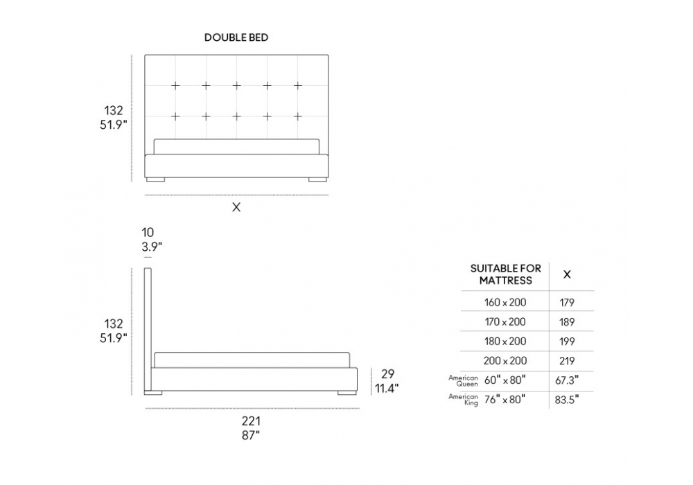 Grenada High conçu par Renato Zamberlan pour Casamania & Horm est un lit rembourré avec revêtement amovible en tissu, cuir ou simili cuir. Sommier à lattes fixe, cadre de lit à l'extérieur du matelas et pieds en bois de hêtre inclus dans le prix. Disponible en différentes dimensions.
