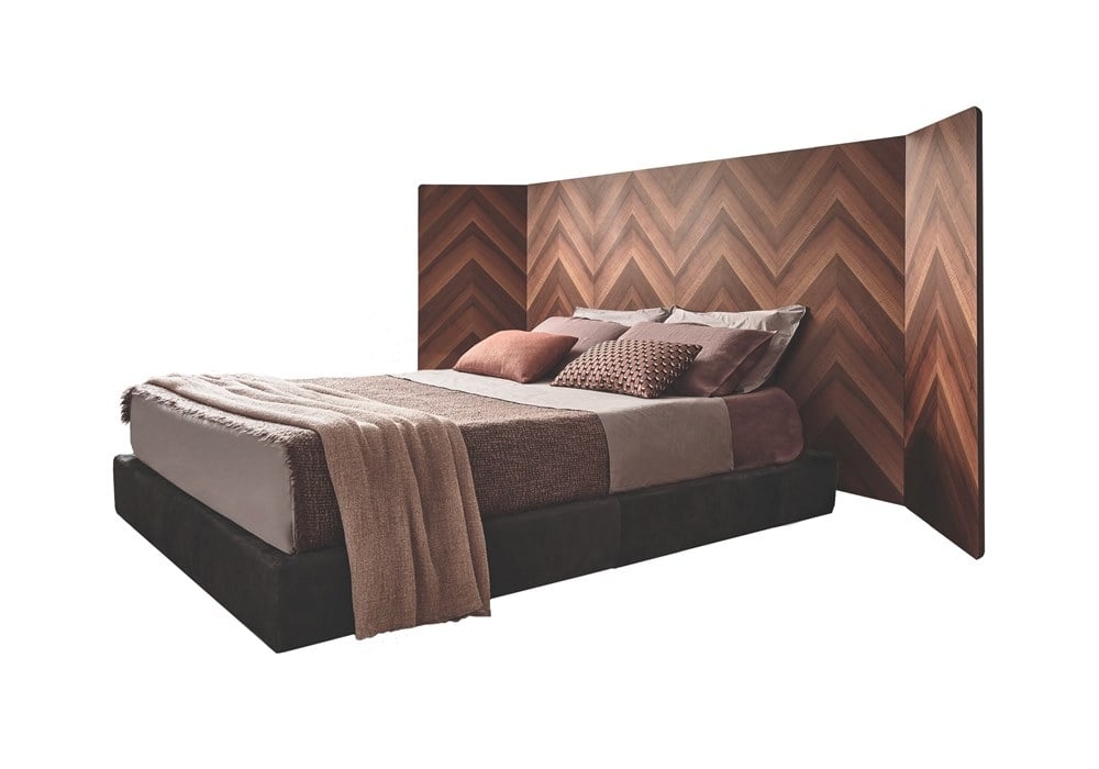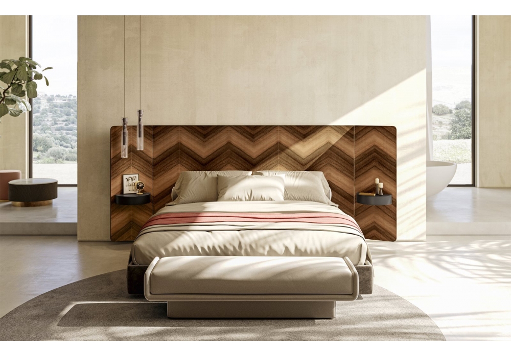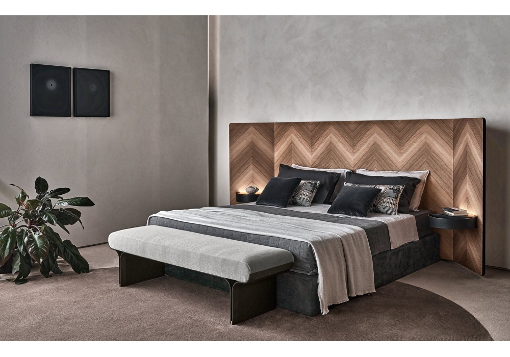 Eve conçu par Pietro Russo pour Gallotti&Radice est un lit avec tête de lit boiserie en bois noyer “Colore” Frisé avec marqueterie à chevrons avec panneaux latéraux orientables. Cadre de lit en polyuréthane expansé indéformable en densité variables et fibre de polyester avec revêtement déhoussable en nabuk ou velours dans les coloris de nos échantillons. Lattes en bois inclusif. Disponible version avec tables de chevet en bois et métal verni noir mat avec lumière LED intégrée et équipé d’un tiroir avec ouverture rotative à 90°. Lumière LED activée par un détecteur de mouvement.