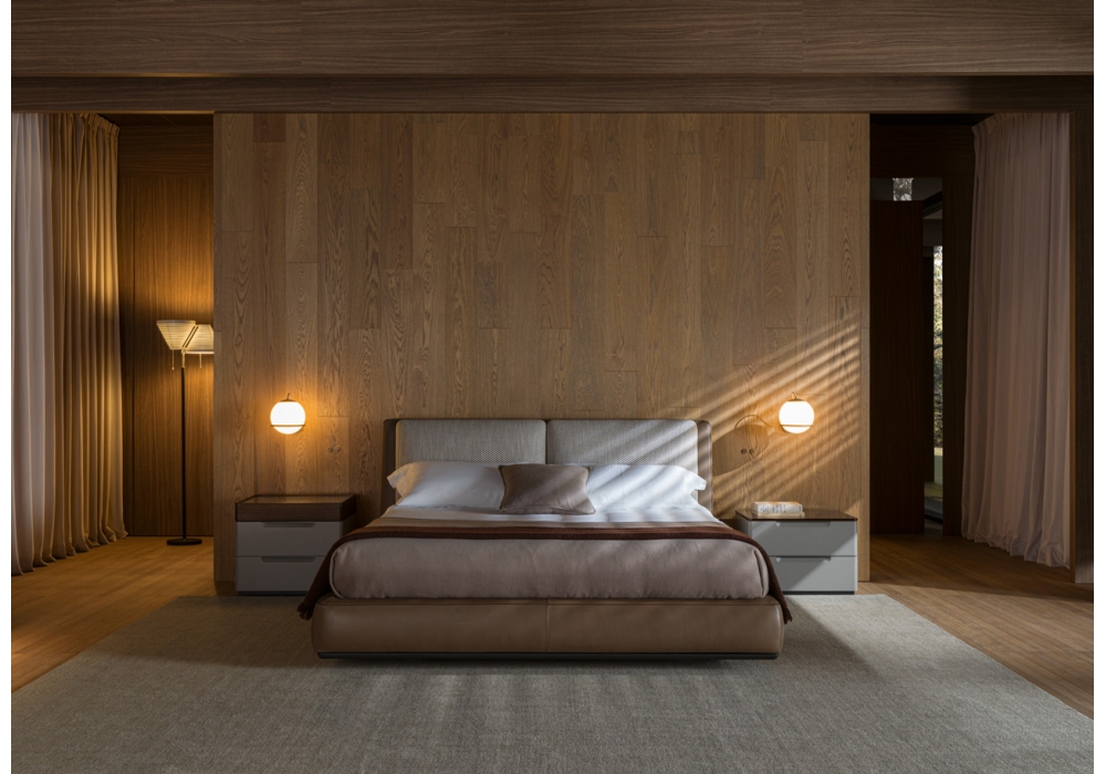 Aldgate conçu par Rodolfo Dordoni pour Molteni&C est un lit composé d'une structure en bois de sapin massif et de panneaux en fibre de densité moyenne et d'un rembourrage en mousse de polyuréthane. Les coussins de tête de lit sont toujours ajoutés au cadre de lit et à la tête de lit. De cette façon, il est possible de personnaliser Aldgate en créant des solutions avec des revêtements unicolores ou en variant la finition des coussins de la tête de lit par rapport au cadre du lit.