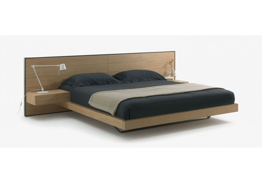Rialto Bed conçu par Giuliano Cappelletti pour Riva 1920 est un lit en bois plaqué latté composé d'une tête de lit encadrée par une structure en fer et un cadre de lit en bois massif, avec tables de chevet intégrées.