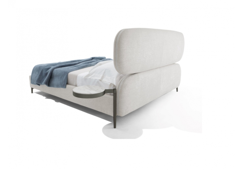 Vibe conçu par Carlo Colombo pour Giorgetti est un lit double disponible en différentes tailles. Le rembourrage est déhoussable, en tissu ou en cuir de différentes couleurs. ). Il est possible d'intégrer un plateau circulaire sur un ou les deux côtés du lit, avec la fonction d'une table de chevet, en marbre ou en noyer canaletto dans de nombreuses couleurs.