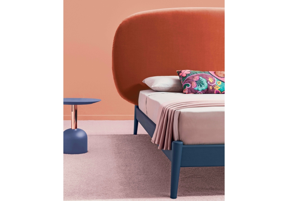Shiko Magnum conçu par E-ggs pour Miniforms est un lit avec structure en frêne bleu profond ou anilline, dossier légèrement incurvé avec revêtement en tissu ou éco-cuir. Disponible en différentes finitions et tailles.