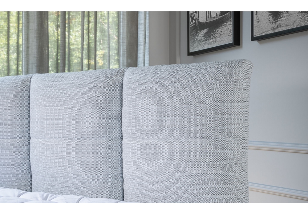 Moon conçue par Treca Interiors Paris est une tête de lit inamovible avec revêtement en tissu. Dépasse de 6 cm de chaque côté et est disponible en différentes dimensions.