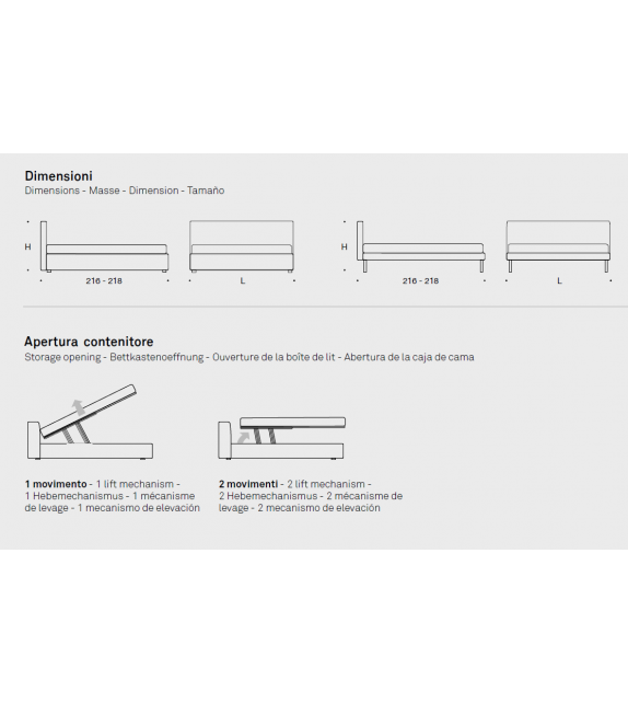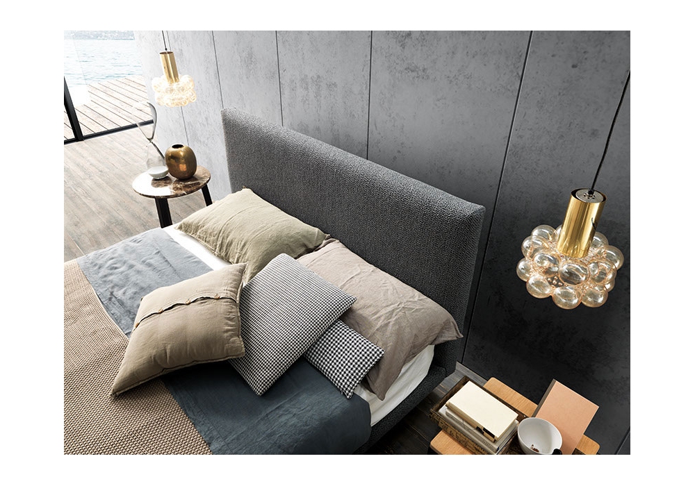 Essential conçu et produit par Valentini est un lit avec structure en contreplaqué dans la version avec coffre de rangement ou en fer peint en noir et recouvert de polyuréthane, base en métal avec lattes en bois anatomiques. Disponible en différentes tailles et en différentes finitions, tissu et cuir entièrement déhoussable.