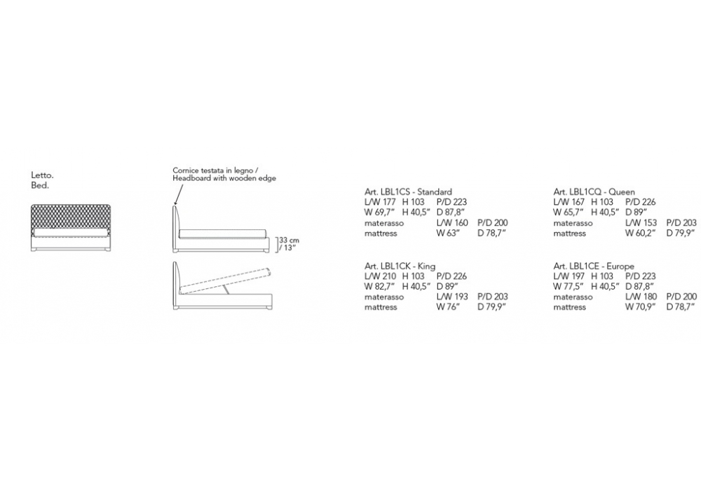Bali conçu par Giuseppe Bavuso pour Alivar est un lit réalisé avec base en frêne massif peint ou noyer national et tête de lit en bois rembourrée en mousse de polyuréthane à densité différenciée avec revêtement en fibre de polyester, avec structure en bois ou rembourrée. Cadre de lit en contreplaqué de sapin recouvert de mousse de polyuréthane et doublure couplée. Revêtement de la tête de lit avant en cuir matelassé au design exclusif Alivar. Base en multiplis de bouleau à lattes courbes avec régulateurs de rigidité dans la zone lombaire. Également disponible dans la version avec conteneur à fond relevable.