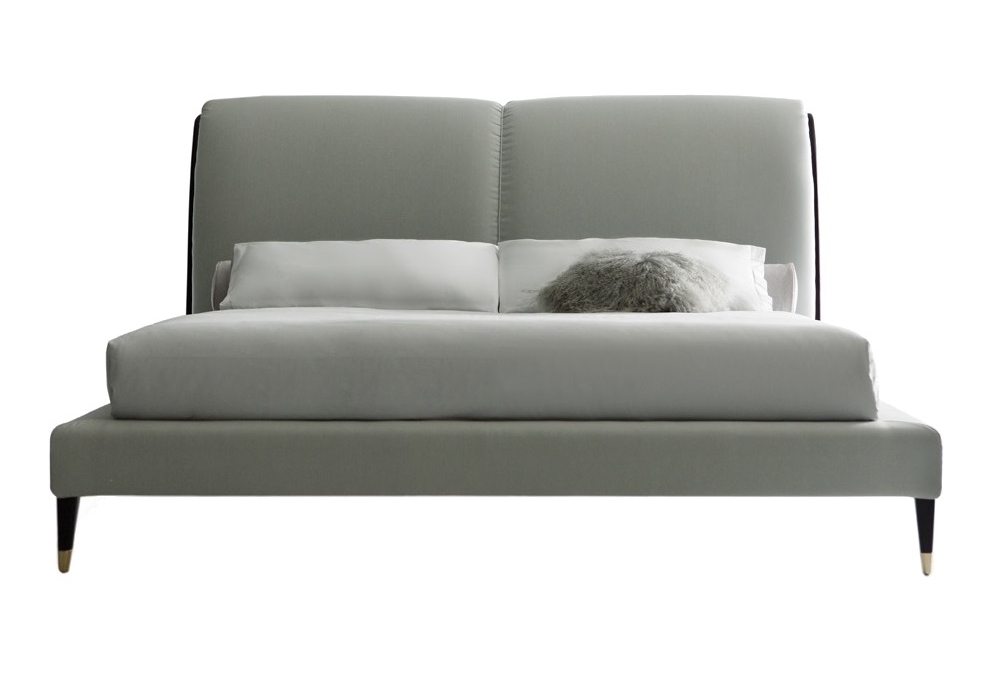 Iris conçu par Castello Lagravinese Studio pour Opera Contemporary est un lit avec pieds en bois de frêne avec embouts en métal et revêtement disponible en tissu ou cuir.