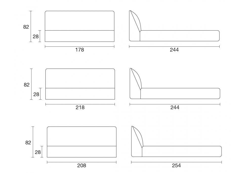 | Dimensions | 178 x 244 x H 82 cm; 218 x 244 x H 82 cm; 208 x 254 x H 82 cm. |