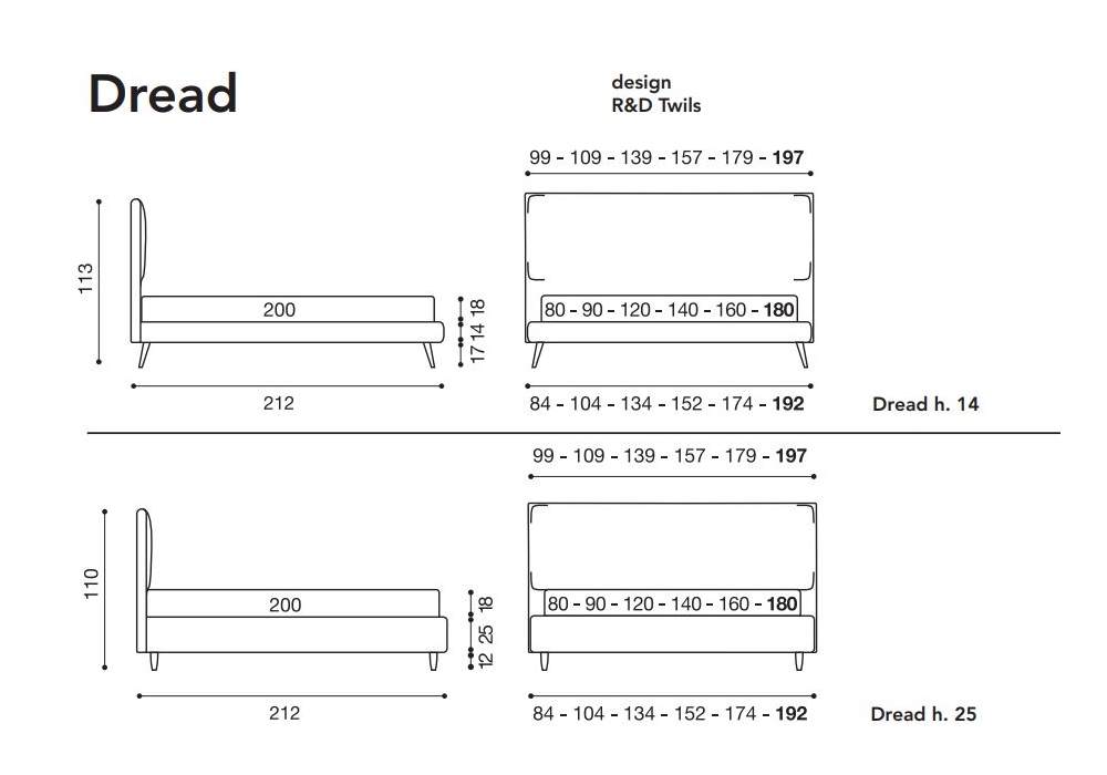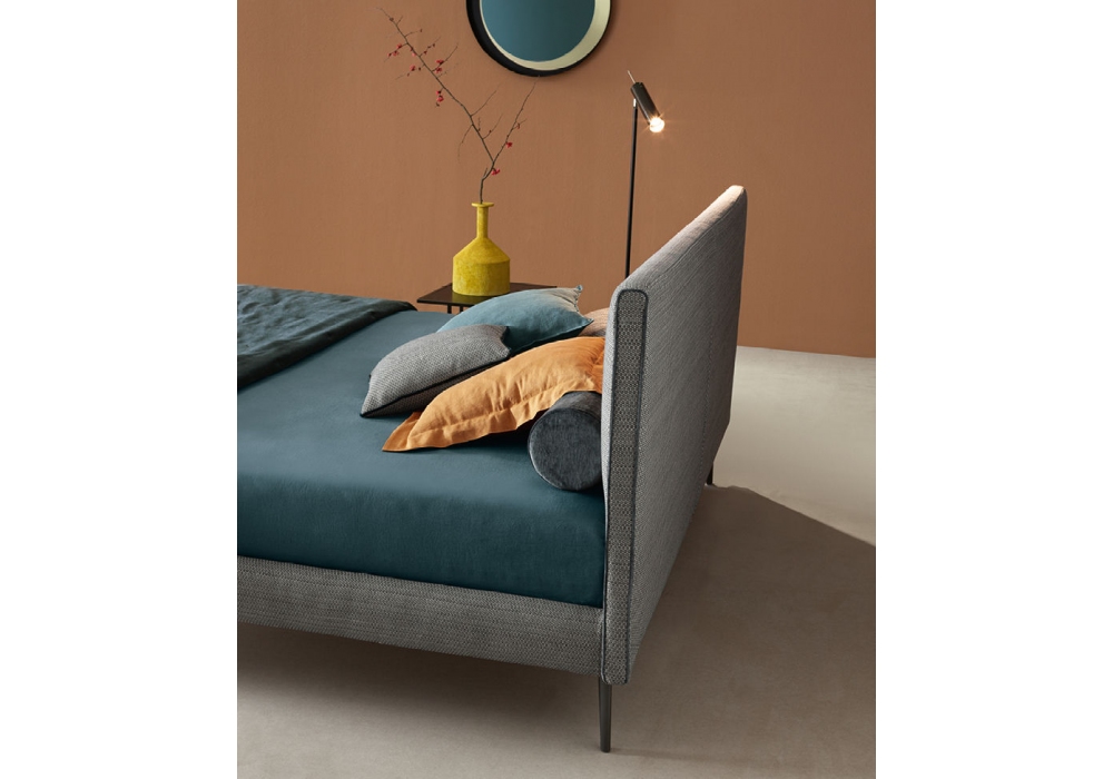 Dread conçu et produit par Twils est un lit rembourré avec un cadre de lit de 14 ou 25 cm de haut, réalisé en différentes tailles. La housse amovible est disponible en différents tissus et couleurs. Les pieds (PIE41) sont carrés inclinés dans une finition en aluminium poli (sur demande, également disponible dans d'autres formes et finitions).