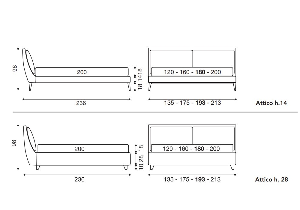 Attico conçu et produit par Twils est un lit rembourré avec un cadre de lit de 14 ou 25 cm de haut, avec des revêtements amovibles (pas dans la version en cuir), disponible en différents modèles et tailles. Le rembourrage est disponible dans de nombreux tissus et coloris. Les pieds sont en bois finition nacre.