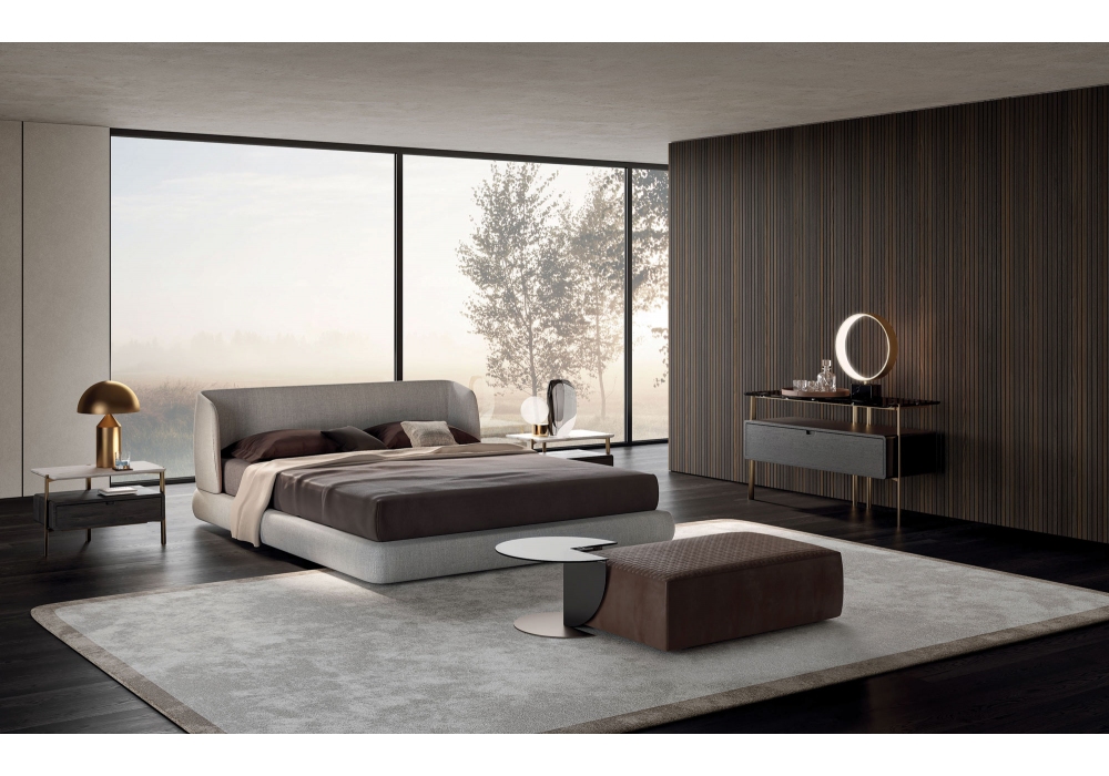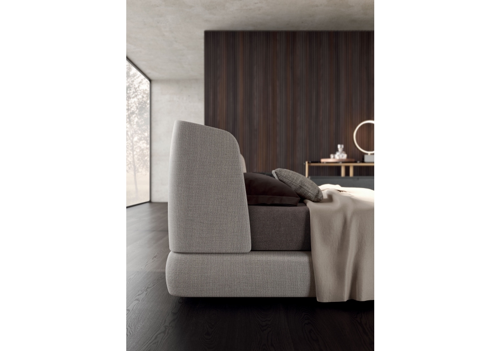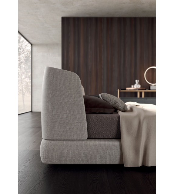 Virgin conçu par Mauro Lipparini pour MisuraEmme est un lit disponible avec ou sans caisson et en différentes dimensions. Il se distingue par sa tête de lit enveloppante, recouverte de tissu ou de cuir.