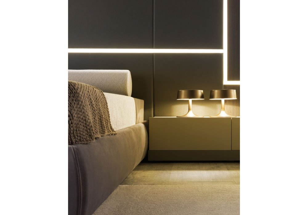 Ghiroletto conçu par Mauro Lipparini pour MisuraEmme est un lit avec cadre de lit rembourré, avec revêtement amovible disponible en tissu, éco-cuir ou cuir, c'est la nouvelle proposition pour la zone de couchage MisuraEmme. Une pièce polyvalente et discrète qui fait de l'interaction avec le lambris son point fort. L'extrême variété compositionnelle s'habille de différentes finitions : tissu, laqué, essence. Le système de panneaux peut également être équipé d'un système d'éclairage intégré et d'étagères en aluminium.